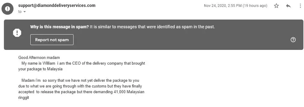 I've received this email from this delivery services asking for payment to be made to Customs in Malaysia in order from them to release package received from Spain. They keep asking for a lot sum of money and feel so suspicious about it. Please help whether this also a fraud? because I try to track the package no from the consignment note seems couldn't...