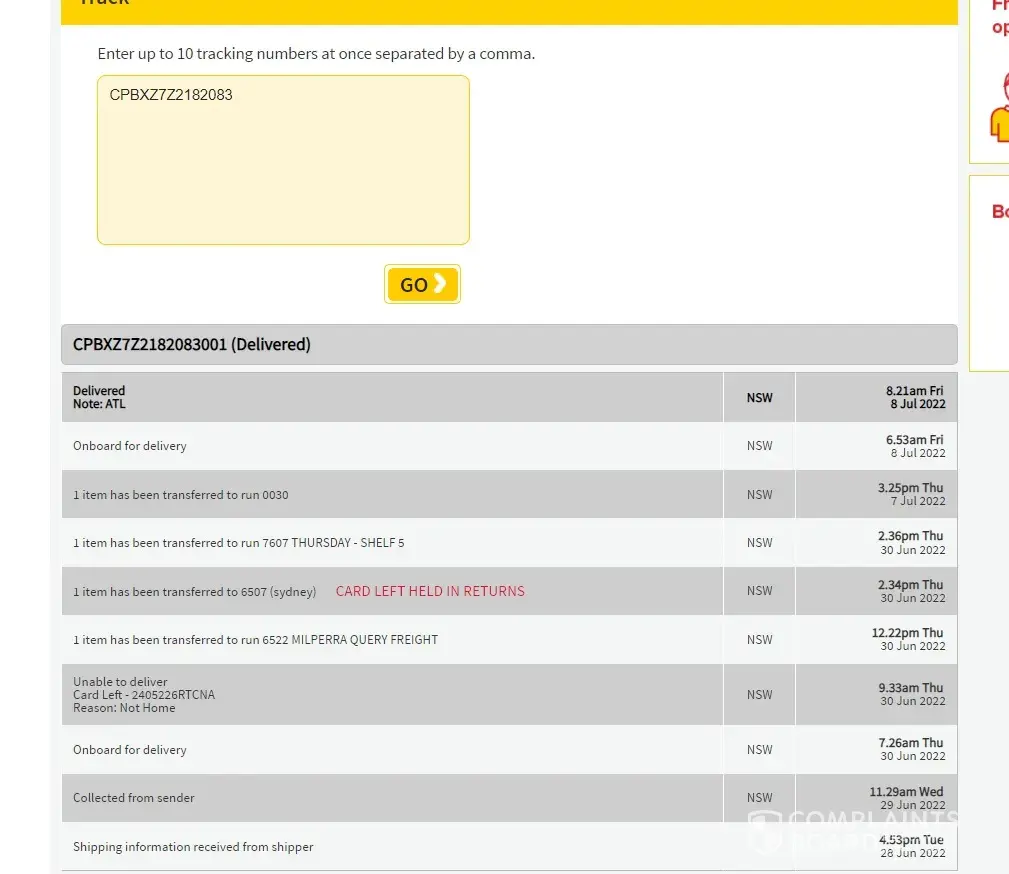 Simple, they never bothered to even try to deliver my parcel. I have no "attempt to deliver" card left either. I am disabled and never leave my home and my career is always here. There is zero excuse for this. I was sent a text telling me to pick it up in some unknown suburb. I cannot walk to get to anywhere because of my disability, which is why I need to have things delivered to my home. No contact number to call. Attempts to file a re-delivery online were met with redfern not recognised as a valid suburb.