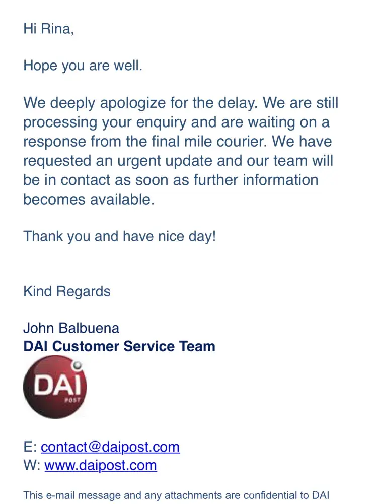 I spent hours on the phone waiting on hold for DaiPost, and when I was able to speak to an agent, they informed me of the new tracking number CPBKYMT0617769 and from their end they could see that the parcel was handed to their Partner Carrier, Couriers Please on November 28 and that it arrived in Brisbane on November 30. When I call Couriers Please I am advised by the automated tracking that my parcel has been delayed.