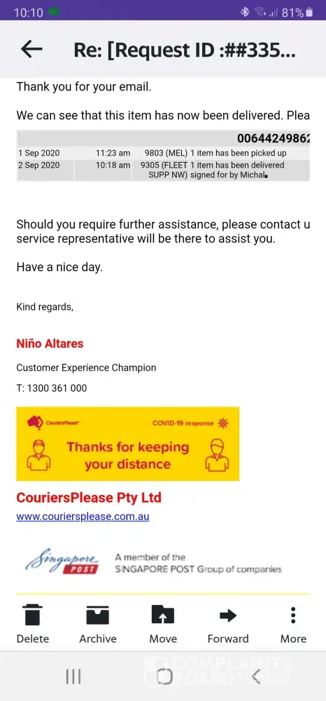 This is about Couriersplease, they picked up a parcel from Qld to be delivered to me at Guildford Sydney. They sent me an e-mail to say it was delivered but it was not.