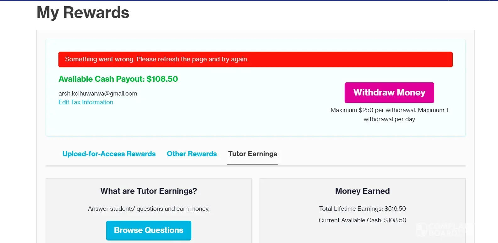 I was trying to withdraw my $250 about 6 days ago and $108.5 yesterday, and after entering my phone number and verification code, it showed 'Something went wrong please reload the page' both times. After reloading the page the money was gone but it is not showing in my Paypal account or course hero account. It is showing as cashed out but I have not gotten any verification from course hero that my money has been successfully withdrawn. I already sent a complaint email 6 days ago for a withdrawal of $250 and in response to that email, the tutor support team told me that they will quickly resolve it with Paypal. But till now no action has been taken yet and my money is still missing. Now my $108.50 is also missing in the same way. I am not able to understand how can same problem can occur back to back. It has never happened before. I want an update on my money. I am already facing troubles for the past 8 days in my account. My account has been temporarily disabled 4 times this month without any reason and now my money is not reflecting. Please help me. Please tell me about the status of my money. I am attaching some screenshots for your reference. Hope it helps