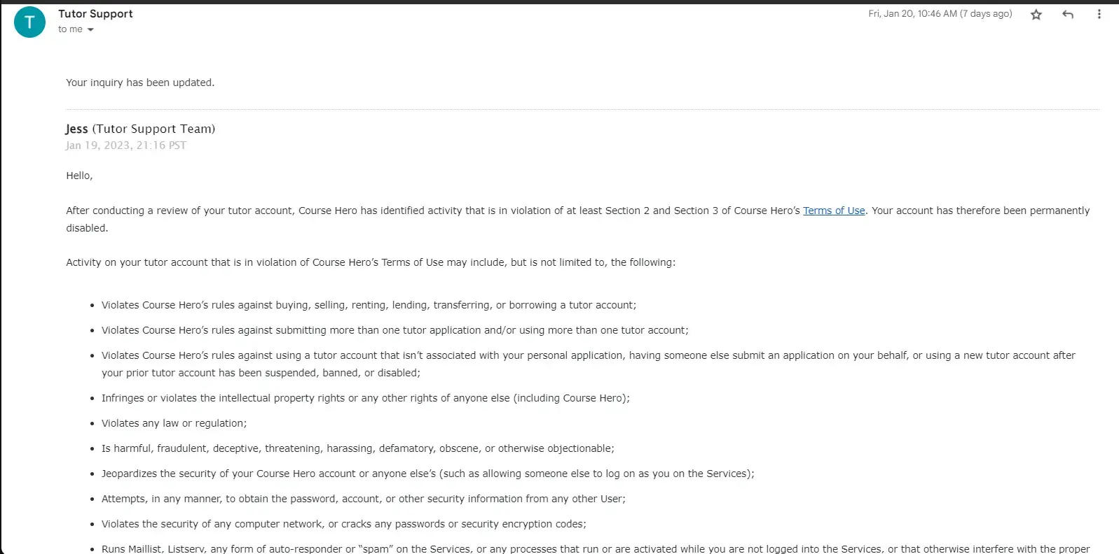 Hi! I would like to complaint about my permanently disabled tutor account. I received three consecutive email saying that they identified unusual activity on my account. First was on December 22, 2022. Second was on January 6, 2023. Lastly, happened last January 12, 2023. I always comply with the requirements but they are just sending automated response. Their tutor support was always sending automated responses and It took days to receive a proper response from them. I also did not worked or answered questions from students for a month because I cannot access my account due to probation and the consecutive temporarily disabling of my tutor account. But still I always receive multiple warnings and violations that made me think they are sending those warnings and violations randomly. Until today, they decided to permanently disable my tutor account. There is no clear and specific reason stated in their email. I don’t think I violated their terms and conditions. I’m working/answering students questions sincerely, I don’t give other people access on my account, I only used my phone and laptop whenever I open my Course Hero tutor account, I don’t comment inappropriate words to students questions, I always enter accurate personal details like phone number, etc. and I never used VPN. It just saddens me that they take my tutor account without a clear reasons. I just want for them to do internal review and restore my account because I’m just starting to work so, give me a chance to do better. Please, be fair to your tutors and don’t revoked our accounts randomly.