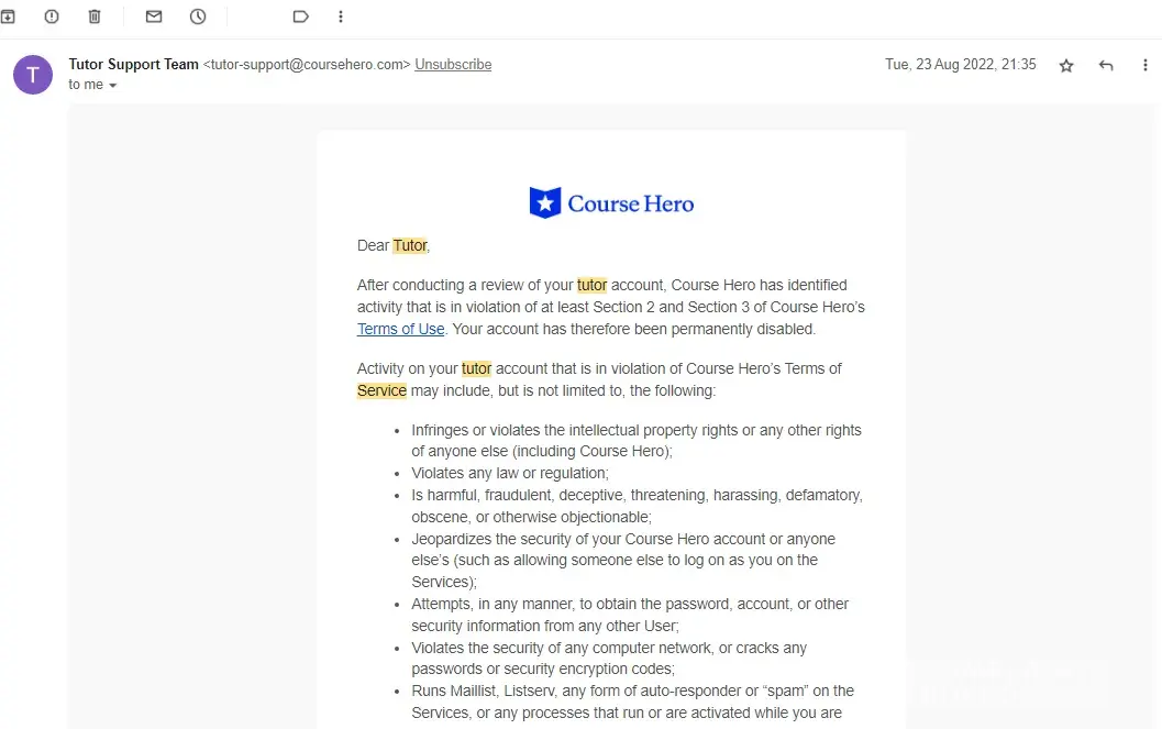 I also received the same kind of email last August, 2022. For all the affected tutors, this is the highest form of fraud. You must use the platform with extreme caution. Otherwise, working for CH without getting paid will be a waste of your precious time and energy. The tutor support team is intentionally closing accounts to siphon money. It is, thus, a fraudulent activity and a contemporary type of slavery. A legal agency must intervene to take serious action against Course Hero for stealing tutors money.