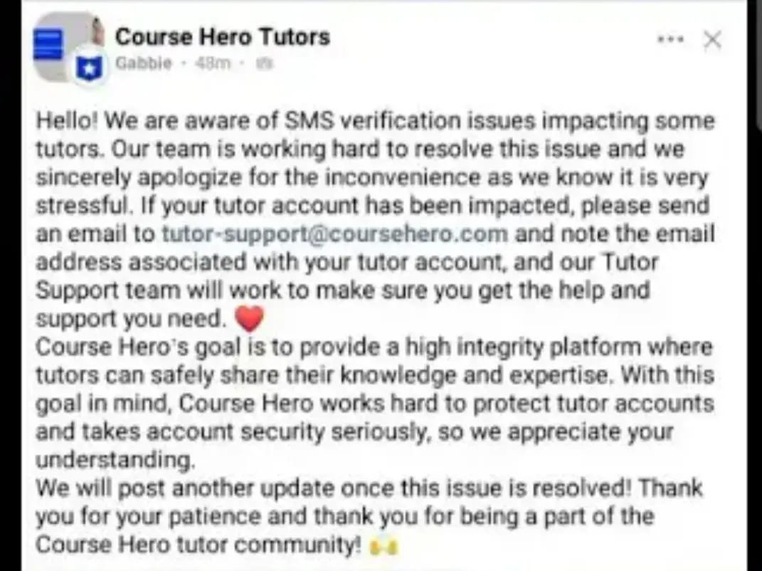 Last December 8 around 1pm, I was about to cash-out my earnings but before cash-out, it needed SMS verification. After I input my phone number it says "my account could not be verified and some features have been blocked. Contact tutor support for details." I then emailed [protected]@CourseHero.com.