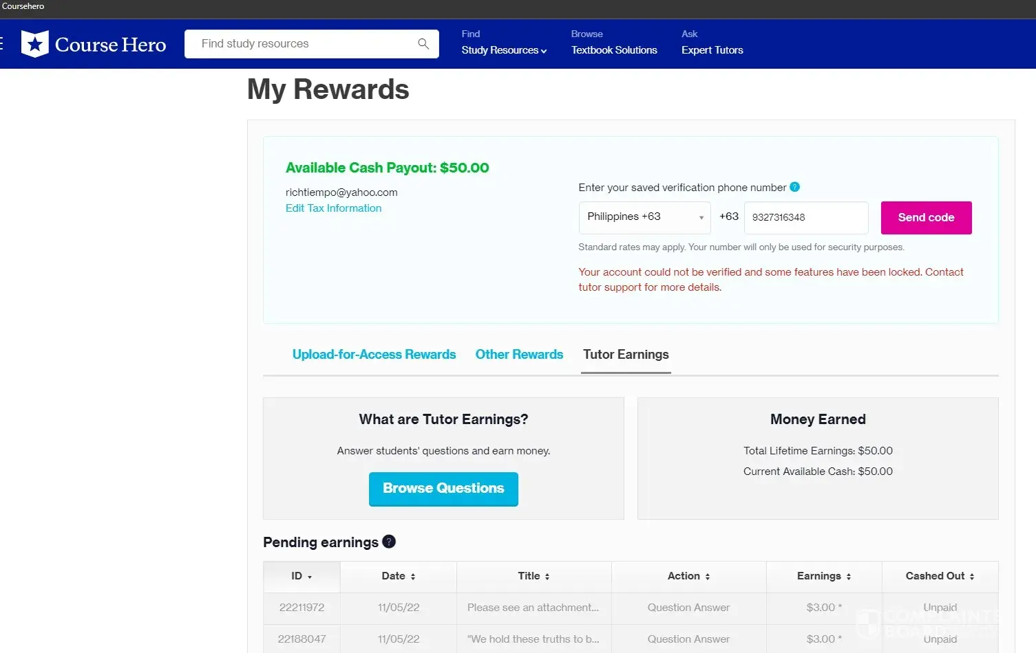 Course Hero - Can't withdraw available earnings - locked account due to verification codes