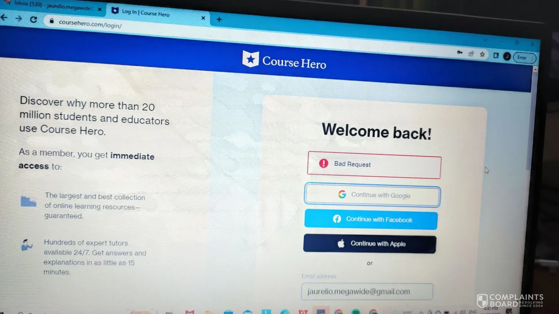 Course Hero Log in problems (BAD REQUEST)