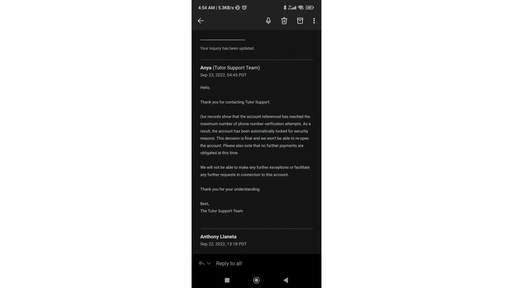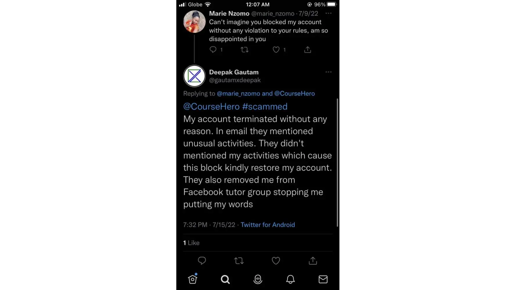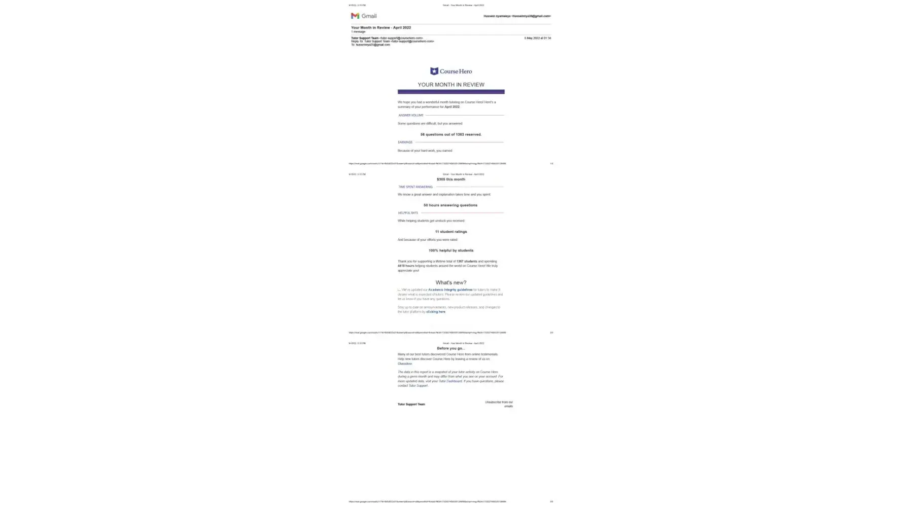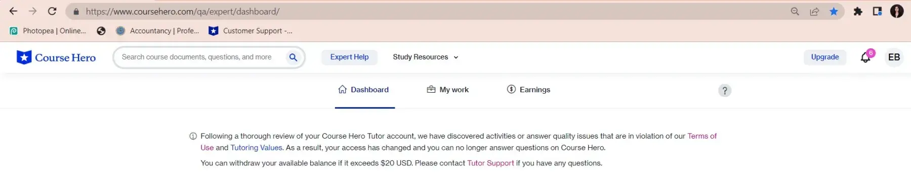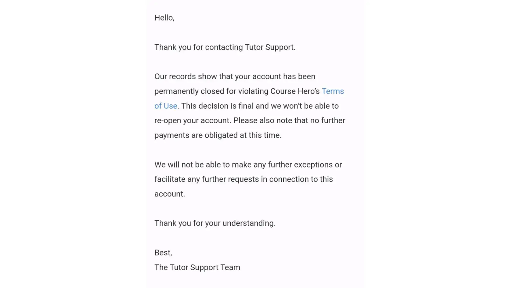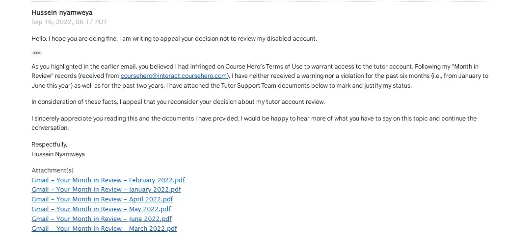 I had not violated Course Hero's Terms of Use. The documents attached attest to and validate my sincerity. I had no violations during the review of my account, which was conducted on a monthly basis from January to June. I do not know what kind of infringement the tutor support team is insisting on. There is something that we are unaware of that is going on behind the scenes, particularly among the moderator team. You see, I am not the only person complaining. Many affected tutors are complaining about this issue. Why are they closing the account when a substantial amount of money has matured in it? We have provided all the required academic assistance to the students. We were ensuring that the students got unstuck in their assignments. However, you closed the tutor account on the basis of a violation of Course Hero's Terms of Use, which I find to be inaccurate and untrue. Something needs to be done in order for the affected tutors to get their money back. This is unfair and unprofessional.