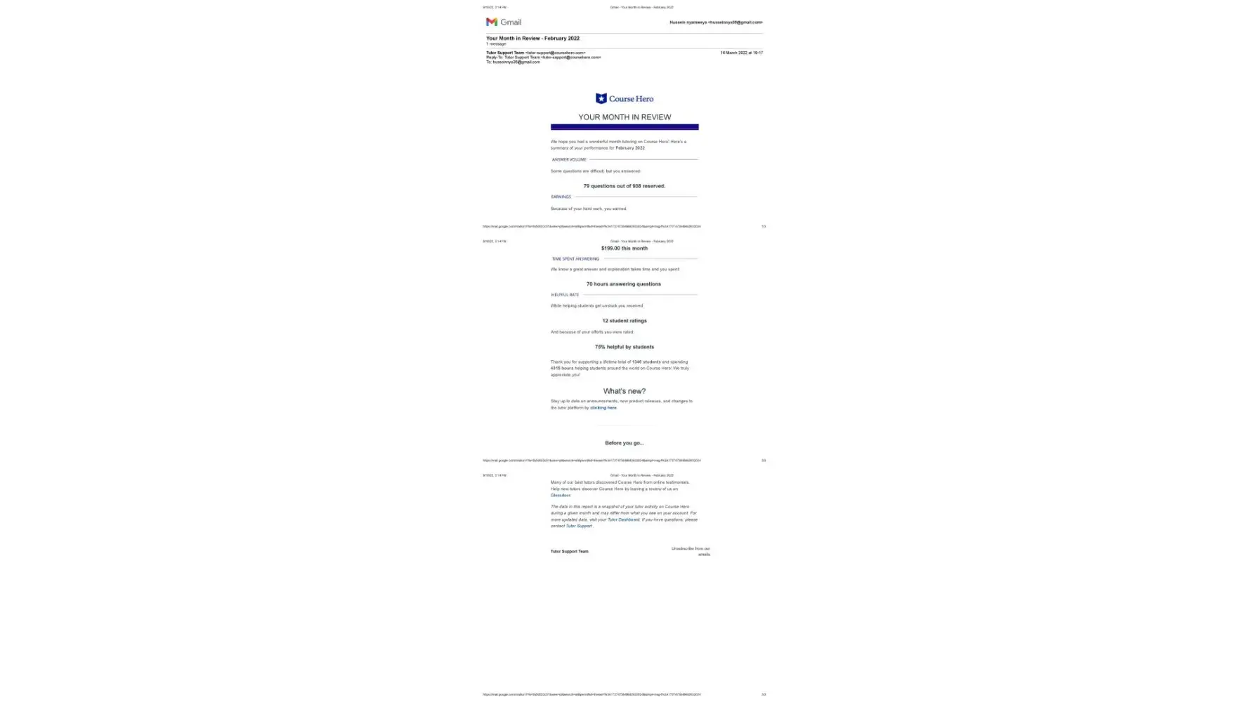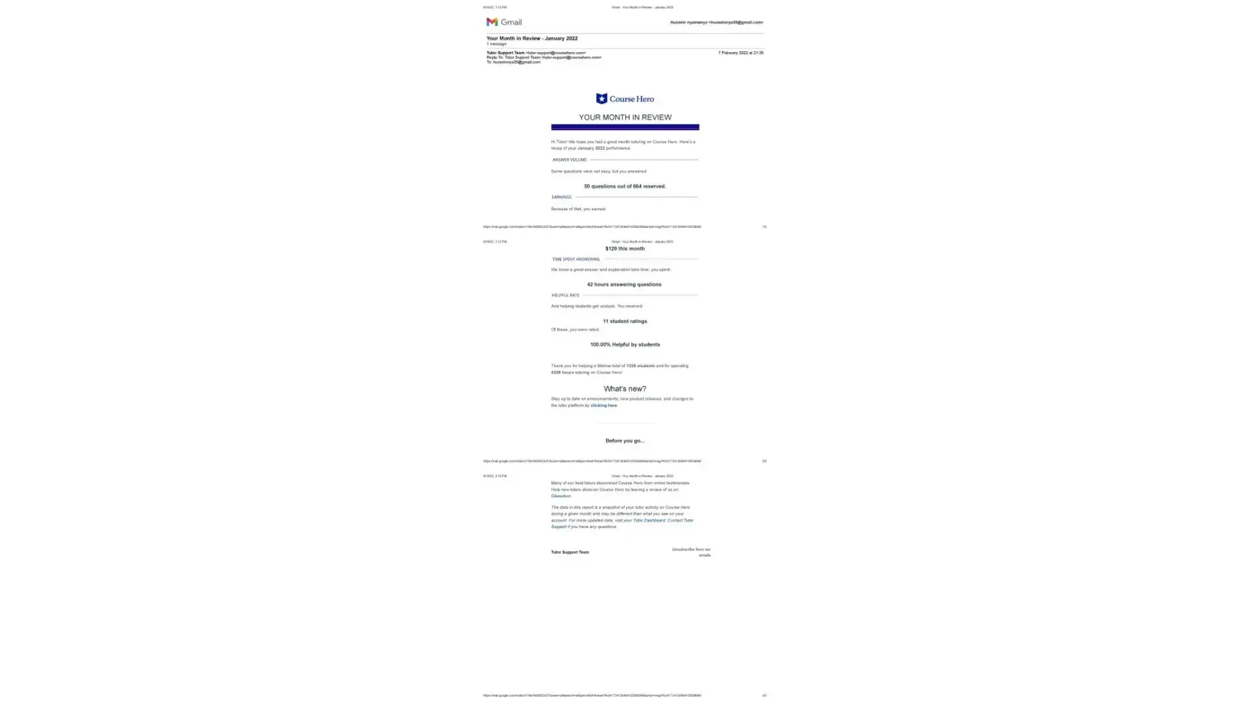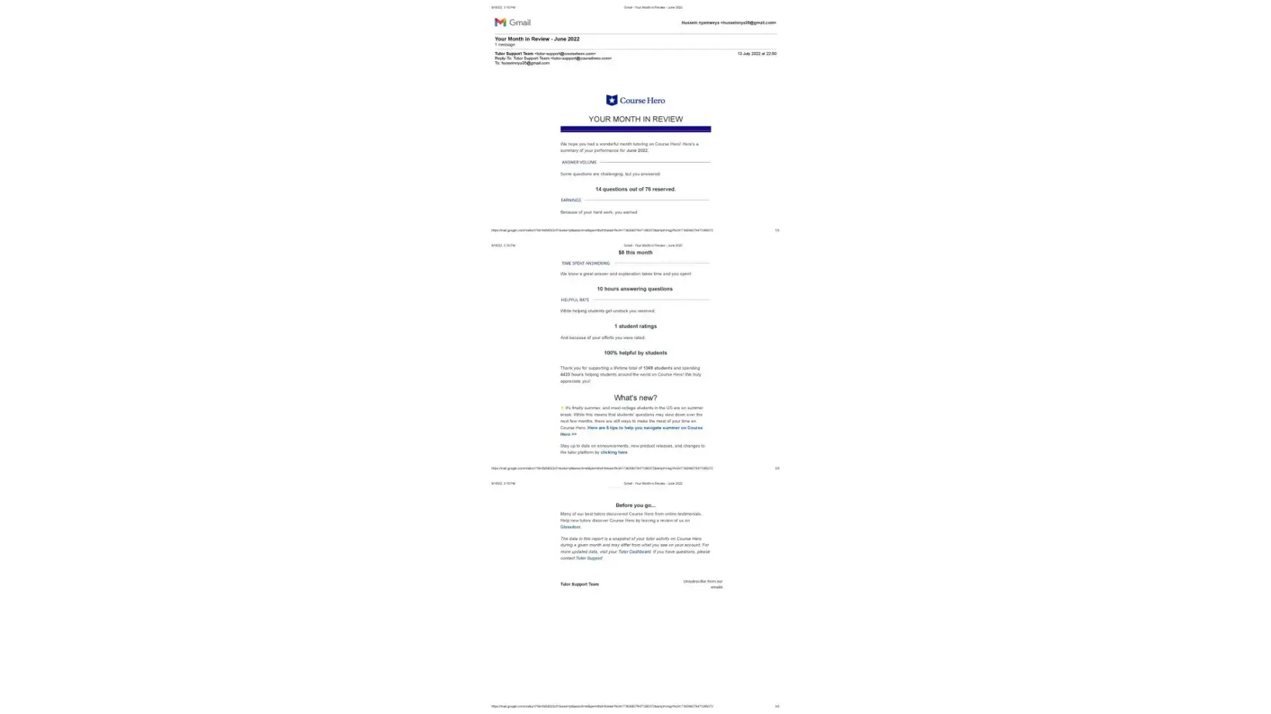 I have been a Course Hero tutor since 2016. My primary responsibility was to provide academic support to students so that they could learn effectively. I was an expert in a variety of academic fields, including computer science, database management, computer networking, philosophy, and MySQL. My tutoring work was going well until August 24th, 2022, when I received an email from the tutor support team stating that my tutor account had been permanently disabled. The account was disabled due to a violation of Course Hero's Terms of Service. I was surprised because, according to the report of the tutor support team's monthly review from January to June 2022, I had no violations. Furthermore, a warning is required before receiving a violation. This year, I have not received a single warning. I've attached the documents from the tutor support team that show the monthly review from January to June 2022. The documents attest to and validate my sincerity.