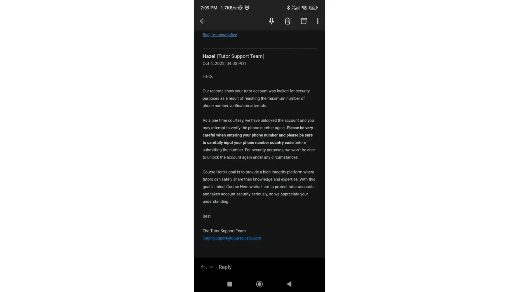 Course Hero has left an official reply on this complaint.