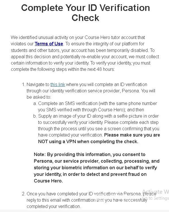 On Nov. 23, 2023 i received on email from course hero saying i need to do ID verification check saying that course hero identified unusual activity on my tutor account that violates their Terms of Use. To ensure the integrity of their platform for students and other tutors, my account has been temporarily disabled. I follow the steps given in veryfying my identity then at the same date, Jude of course hero support team responded that my account was already re enabled. I was able to use it. Then the next day, Nov. 24, 2023 suddenly i can't access again my account. Then an email from course hero was sent saying i need to do ID verification check again. So i did the process again but this time there were no response from the support team.