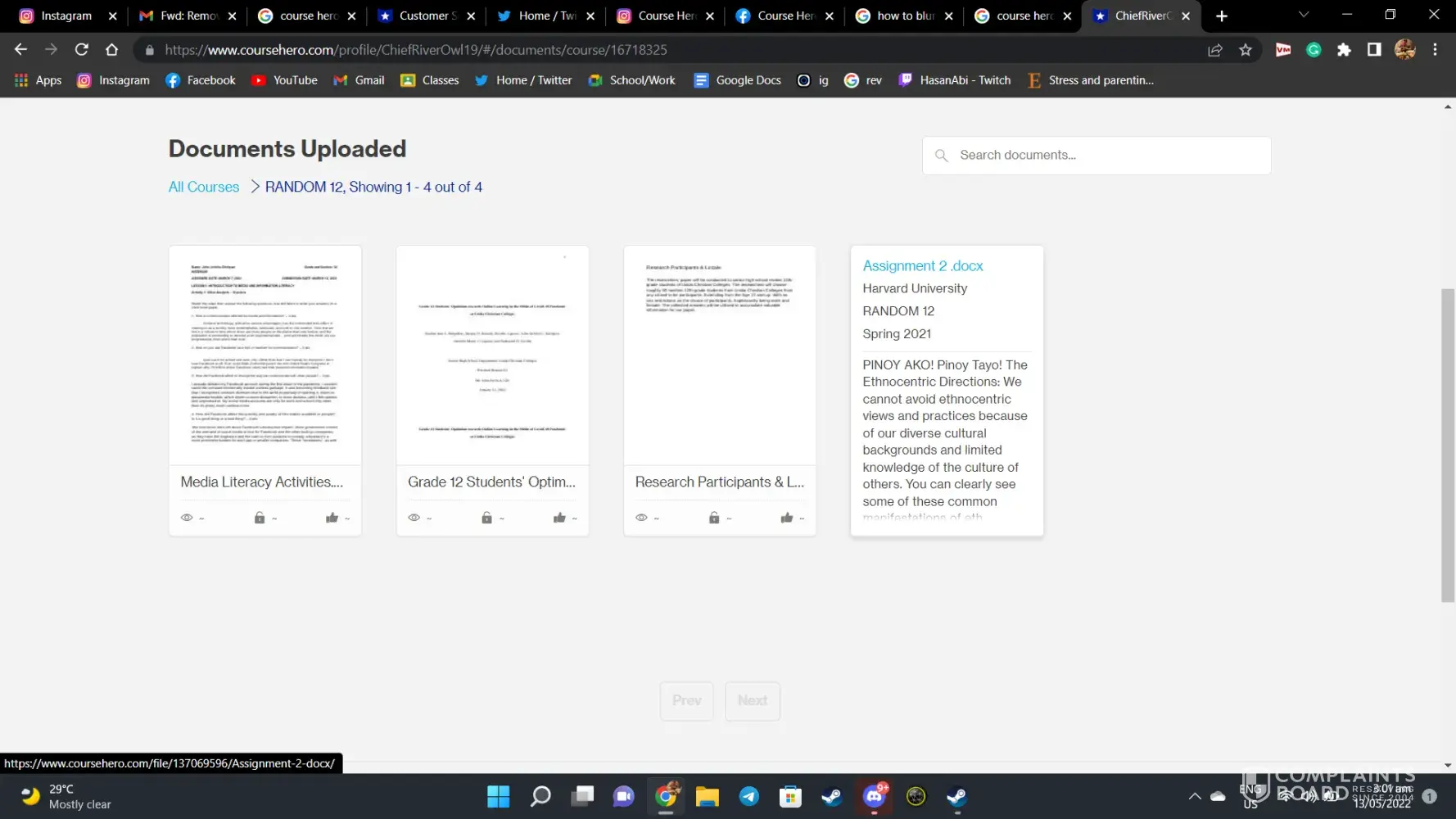 I have a course hero account and I would like all the documents that I uploaded today to be deleted. My professor recently reached out to me to delete the documents for copyright reasons. Please see the pictures below are the documents that need to be deleted. Thank you in advance!