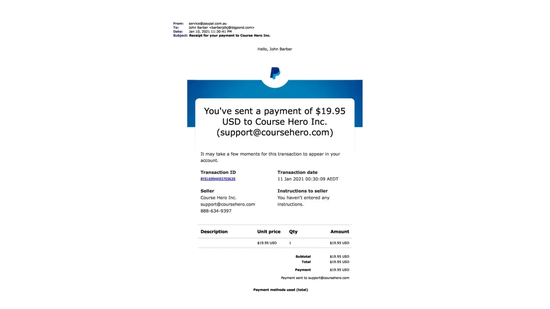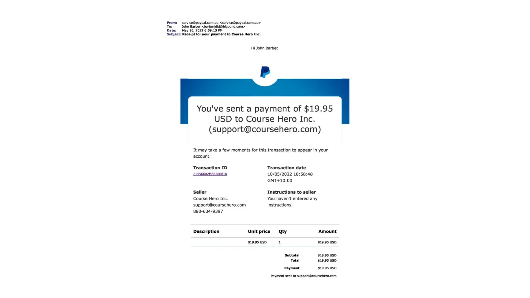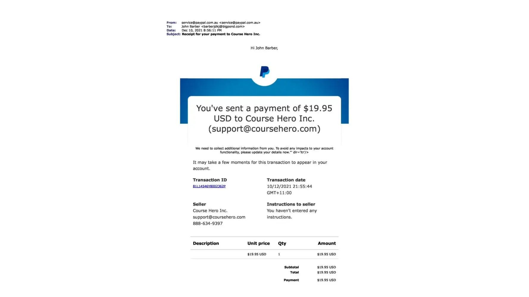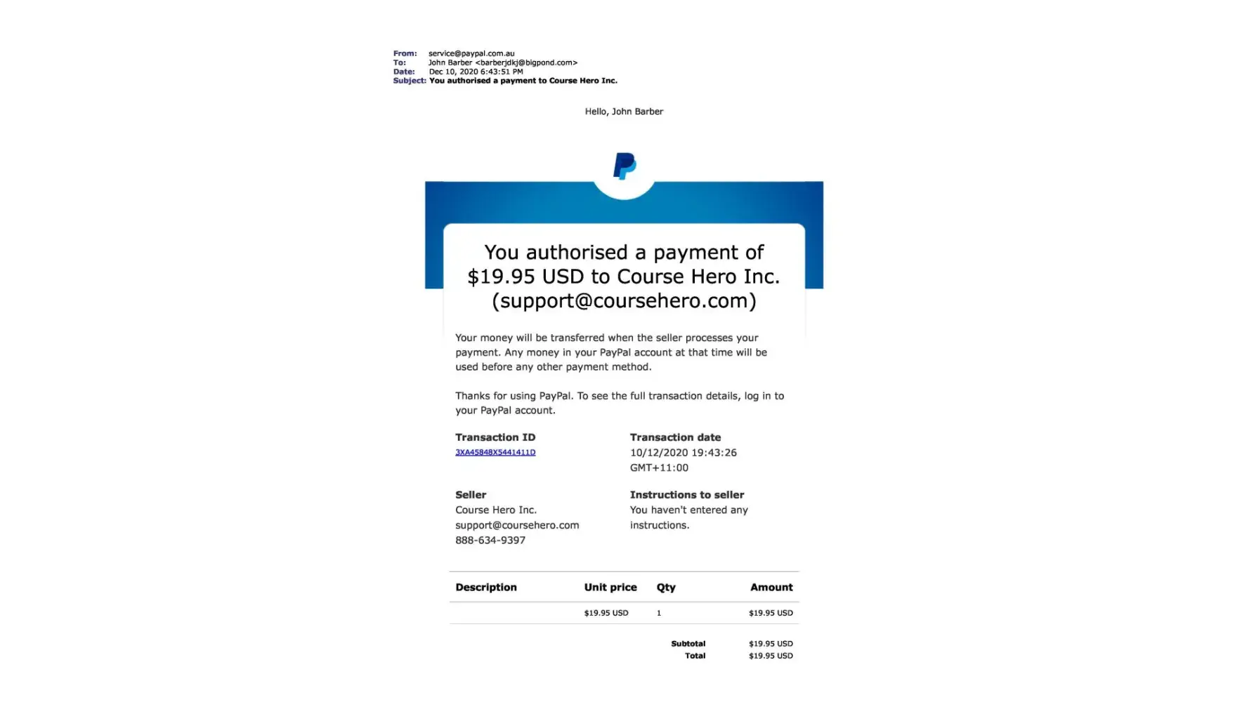 Upon canceling this paypal payment and contacting Course Hero by their own admission they state "Moreover, we are unable to locate an account under [protected]@bigpond.com. "