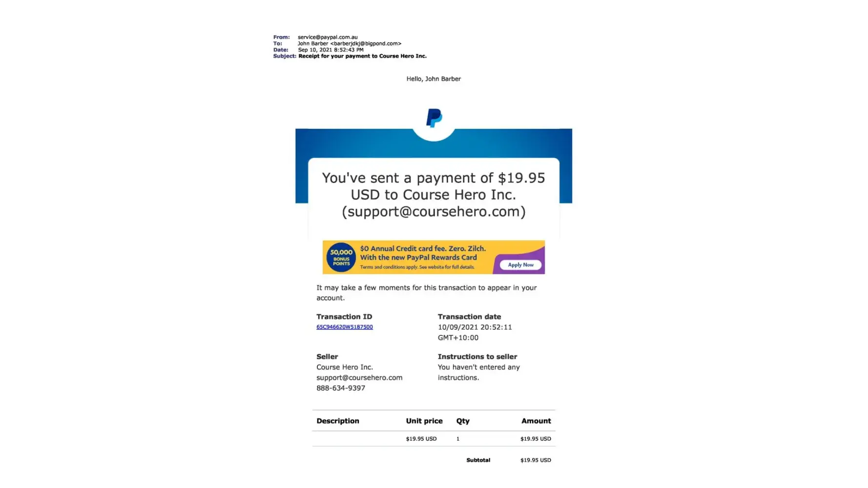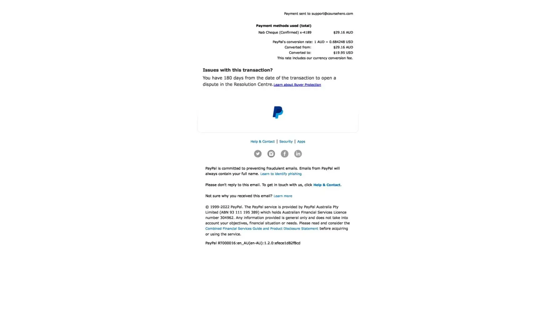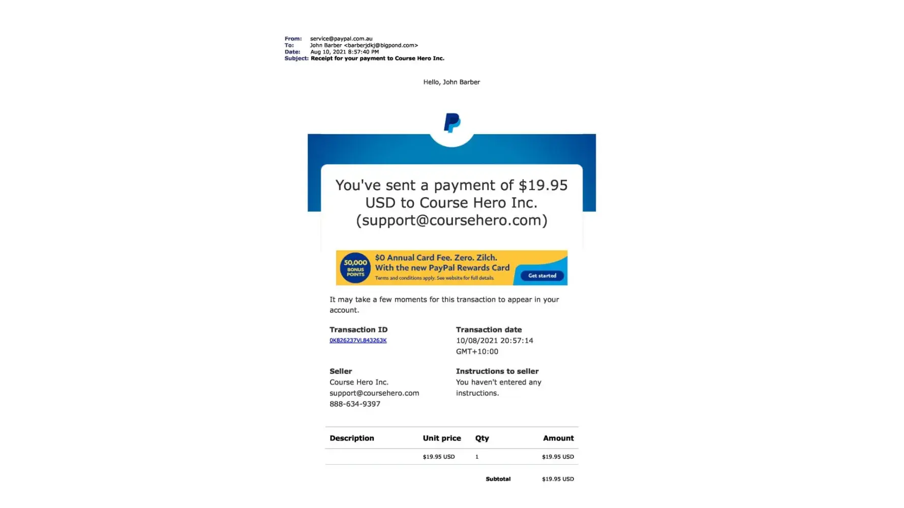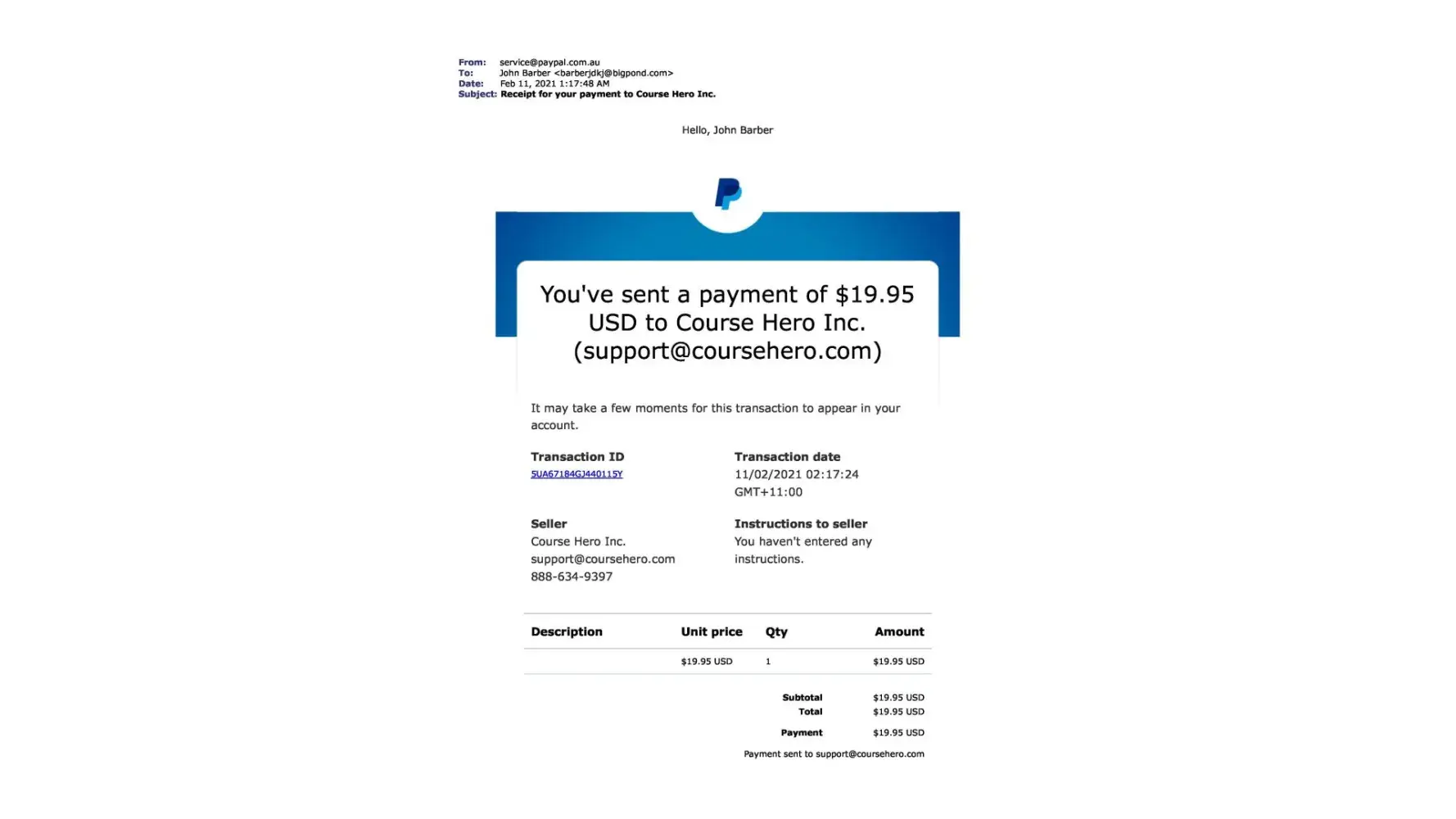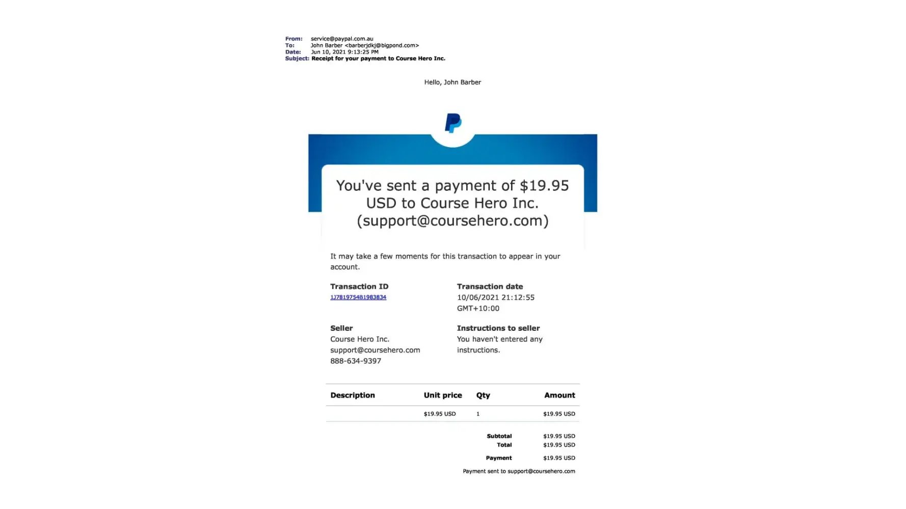 Upon canceling this paypal payment and contacting Course Hero by their own admission they state "Moreover, we are unable to locate an account under [protected]@bigpond.com. "