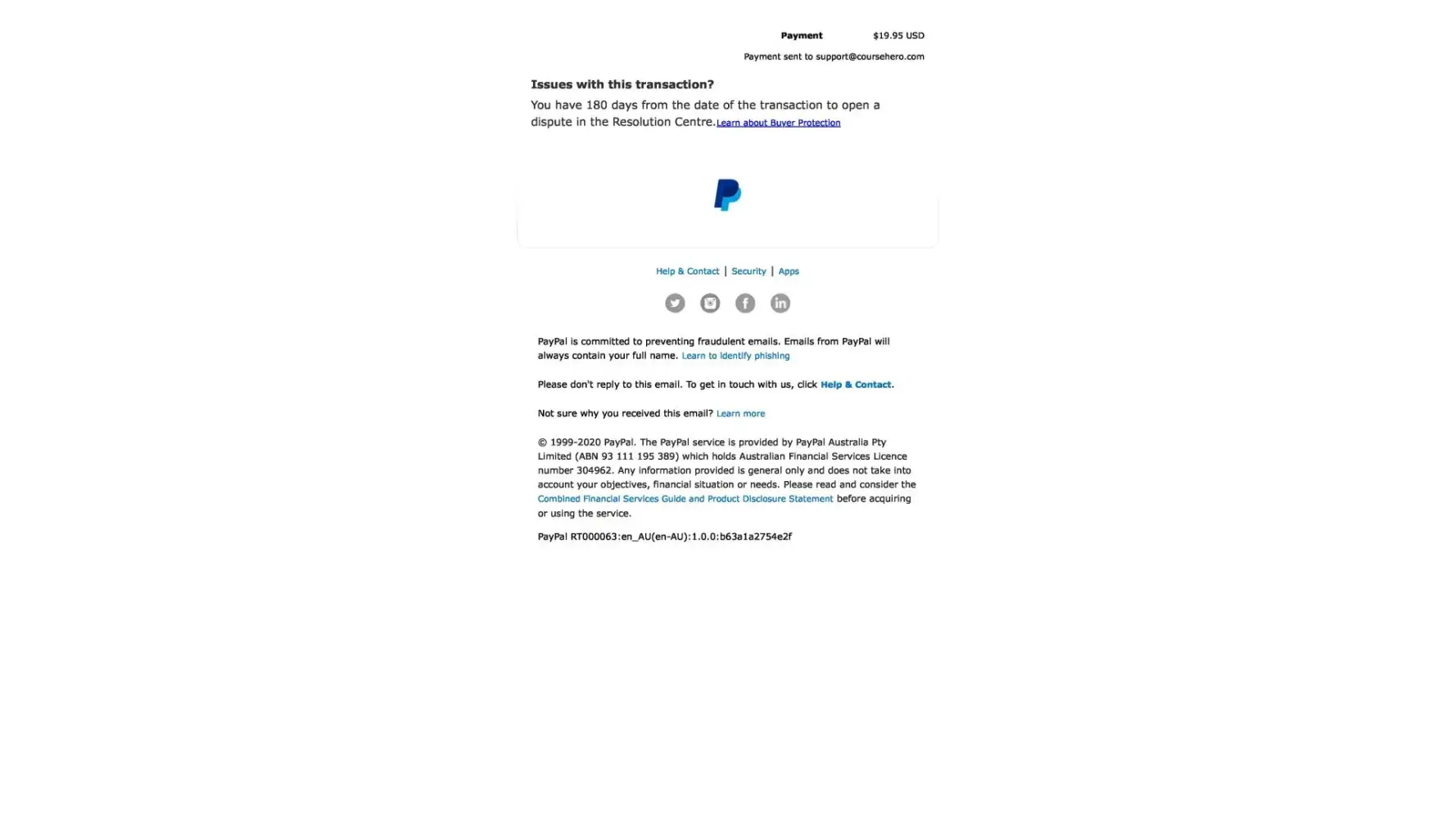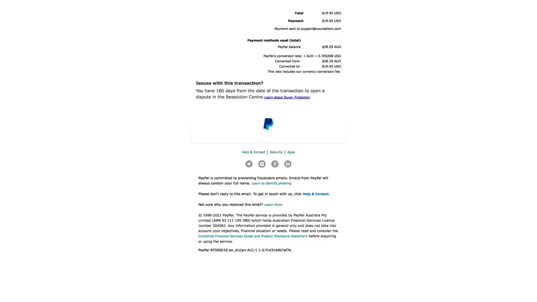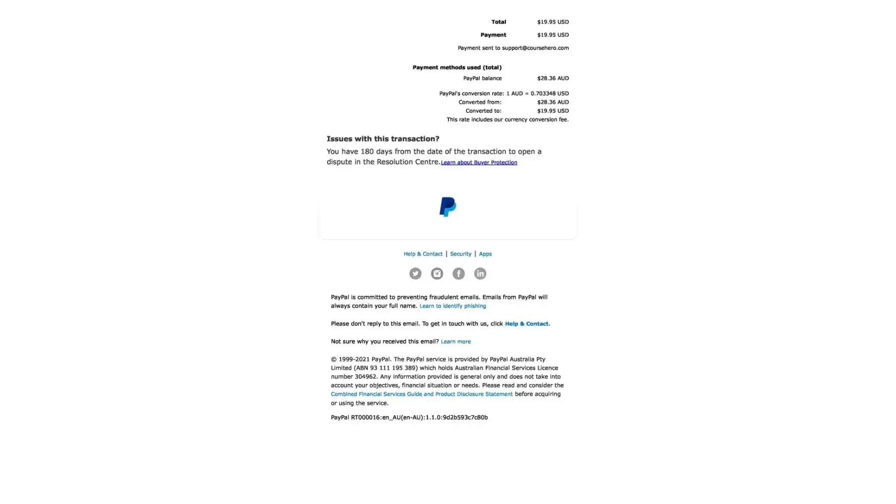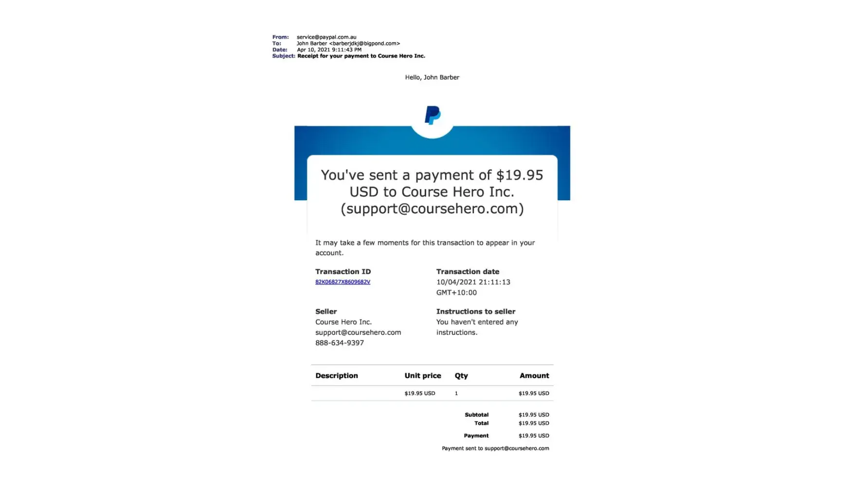 Upon canceling this paypal payment and contacting Course Hero by their own admission they state "Moreover, we are unable to locate an account under [protected]@bigpond.com. "