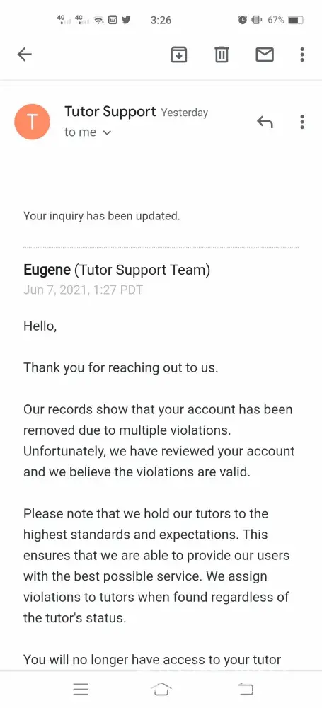 I have finished my probationary period last Monday June 7 2021. Apparently, I received another violation which resulted to revoking my account. The violation says that I plagiarized my answer even if its not. When I ask the support team they just told me that the violation is valid without any further investigation on how they come up on that comment. I have attached some supporting docs with regards to this complain.