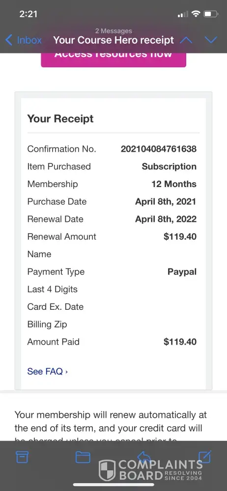 I subscribed for a special offer course hero offered to me for a 1 month description for $14.95 on March 28 and on the same day I have cancelled the reoccurring payment in my account so that course hero cannot take automatic payments in my account. By the way the 2 month subscription I subscribed is not the same as the annual subscription where it states that you have to pay $119.49 up front. The subscription is just for 1 month. But comes April 8 course hero charged me $119.40 for an annual subscription that I have never even subscribed to. So I filed a dispute with PayPal for an authorize subscription and for some reason course hero won the dispute and PayPal didn't refund my money. I called course hero and refuse to refund the $119.40 they stole from me and their reason is because I filed a dispute with PayPal and they kept insisting that the the transaction from PayPal is frozen which does not make sense why is it frozen if they won the dispute. It don't even make sense that I just signed up for a month subscription and a week after I got charged for a year subscription even though my month subscription just started. I called PayPal again and tried to reopen my dispute but PayPal could not open the dispute anymore and advices me to call the merchant and ask them to refund me the money again but when I called course hero again they kept insisting that refund is out of the option already. It has been so stressful in part and I do not have the funds at this moment. I just want my $119.40 back. Their customer service people are very rude as well. Course hero just steal peoples money. Do not subscribe or even think about putting your payment information to course hero because they will just take your money and have you sign up in a subscription that you never even authorized for.