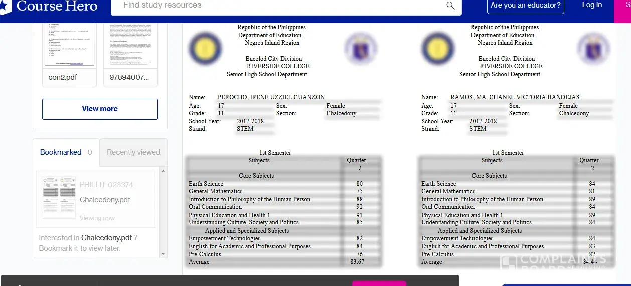 Report Cards, research papers, and academic requirements were illegally uploaded on Coursehero. Most likely, the user ConstableMonkey3665 must have uploaded some random files from a computer to get access to one particular file.