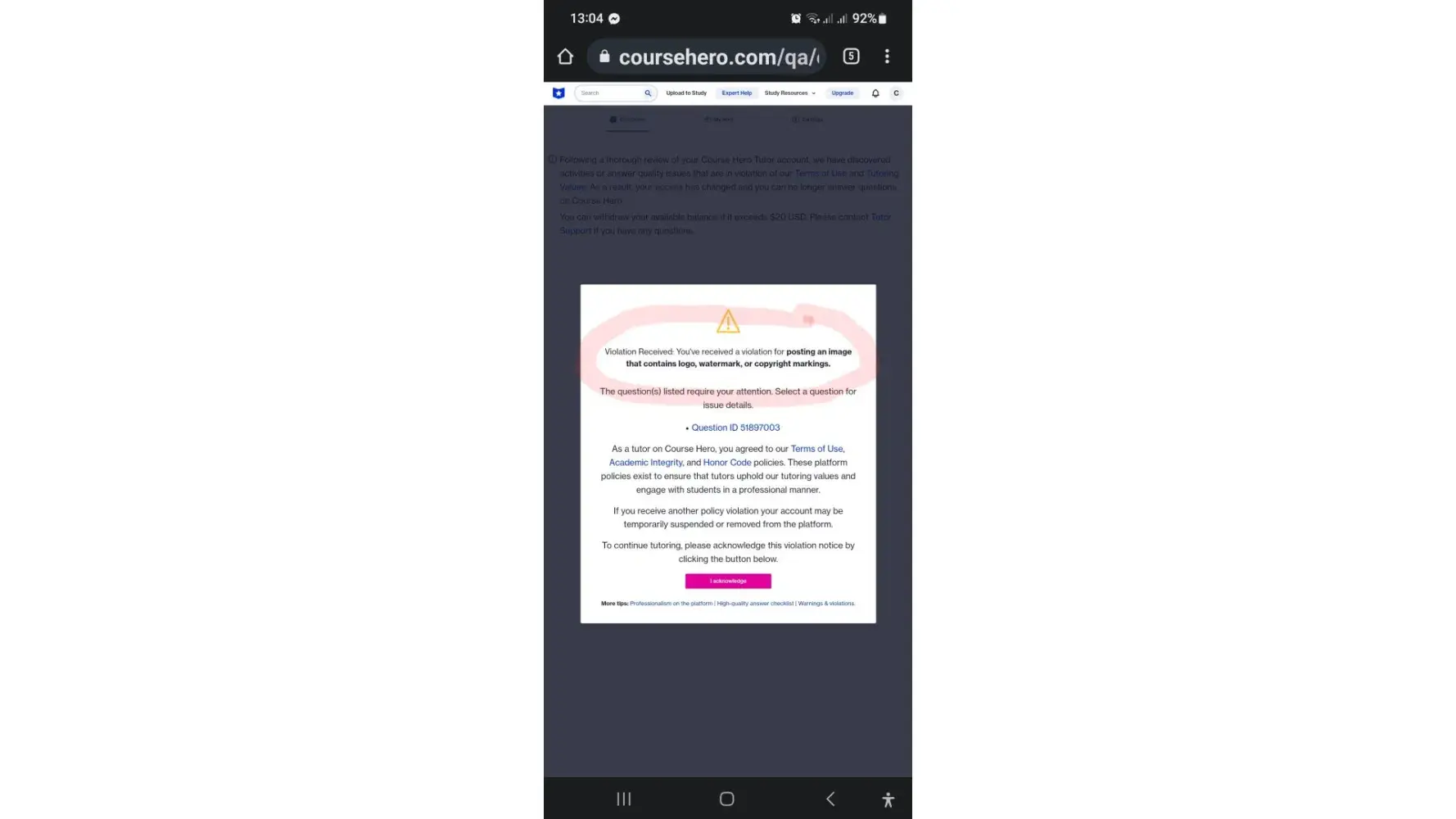 I was a tutor at Course Hero & barred from answering questions on July 3, 2023. I was accused of uploading an image that wasn't mine. I tried to press the question ID but what came out was COM2.jpg. I emailed Course Hero support for details of my violation but none was given. All the answers I submitted have a backup copy in their editor because I take an image of my answer in their editor and repost it in their editor. Because I have experienced my answers being truncated when I submitted my answers before. I realized now maybe their editor has a watermark. I have documentation of all my Course Hero answers from April 20 to July 3, 2023 to prove all answers are original and mine alone.
