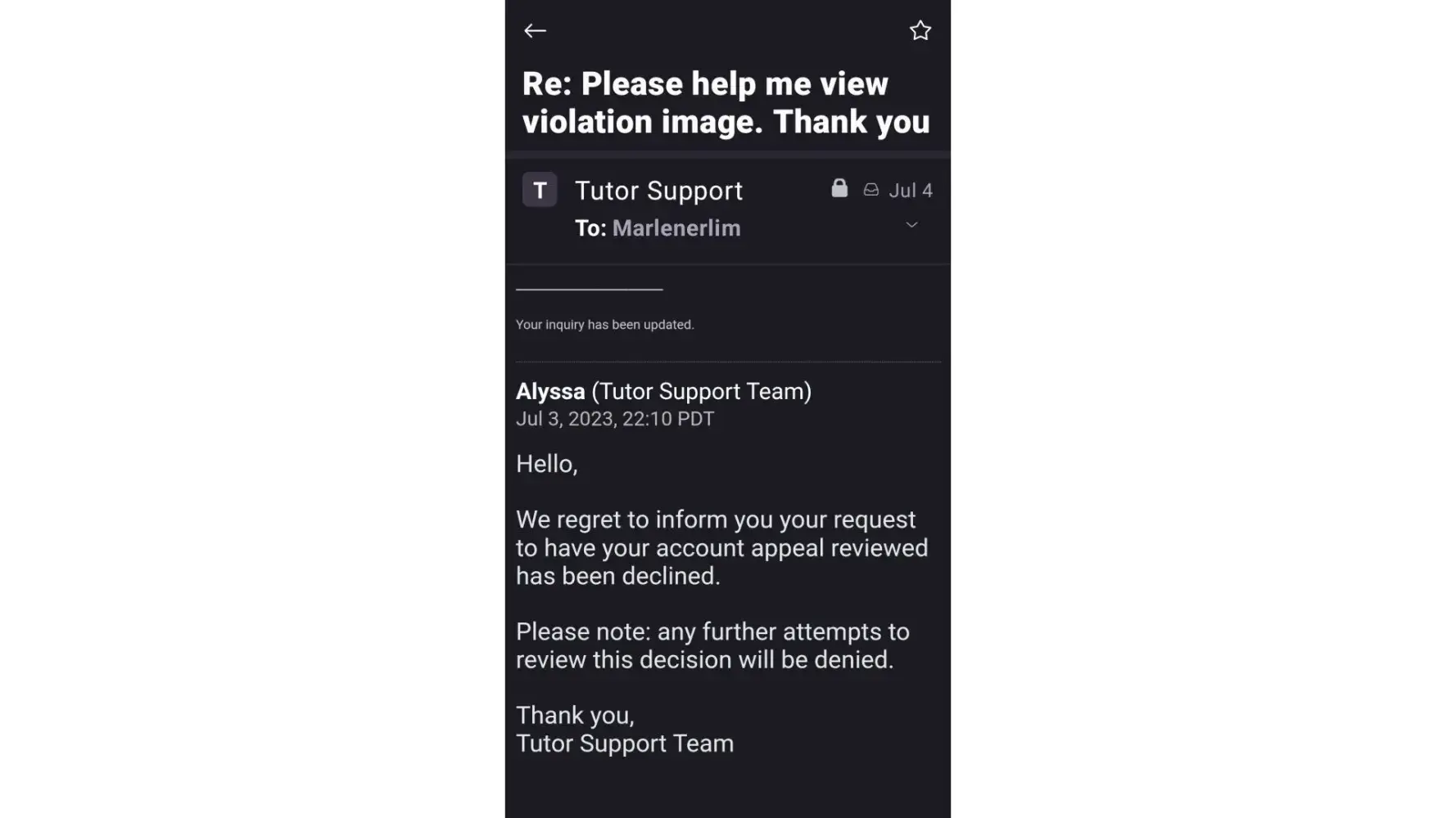 On July 3, 2023, I was accused by Course Hero for uploading an image that wasn't mine. During the1st week of July 2023, I then filed a complaint on complaintsboard.com. On July 12, 2023,I received an email from complaintsboard.com saying that the issue has been resolved and I was recommended to be "reaching out to our Tutor Support team as they are more specialized to handle your issue and resolve it.". The issue isn't resolved because I received an email on July 4, 2023 from Course Hero stating "any further attempts to review this decision will be denied".