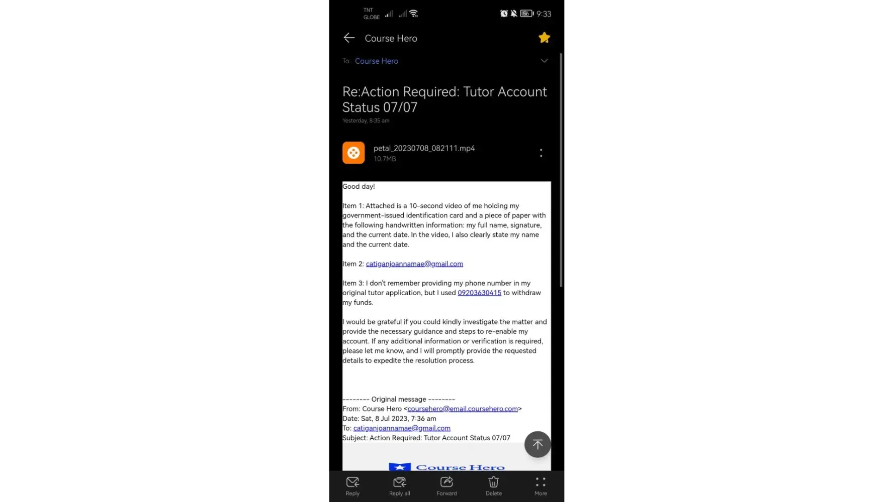 On July 24, 2023, I reached out to [protected]@coursehero.com, seeking help in verifying and updating my phone number to enable me to withdraw my earnings. Instead of addressing my query, my account was permanently disabled. After which, I sent an email to [protected]@coursehero.com on July 24, 2023, explaining the situation, for which I have not received a reply till today: