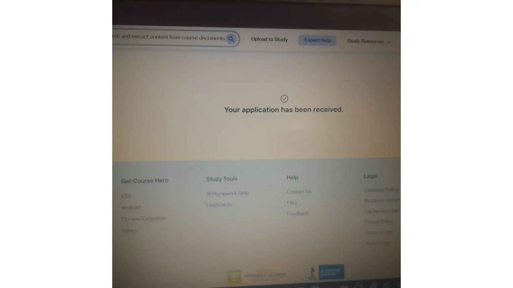 Hello course hero team, I have applied for coursehero tutor application .it's been since 2 weeks I have applied for the course hero tutor application, I have submitted the application even though I did it ur sending me to finish the application and if I click the link it's showing ur application has been received I am confused with this behavior would u please sort out this problem and tell me whether my application is accepted or not.And I have attached the photo where it's shows application is recieved.Even though I have mailed you several times you didn't reply me.So please review my application.