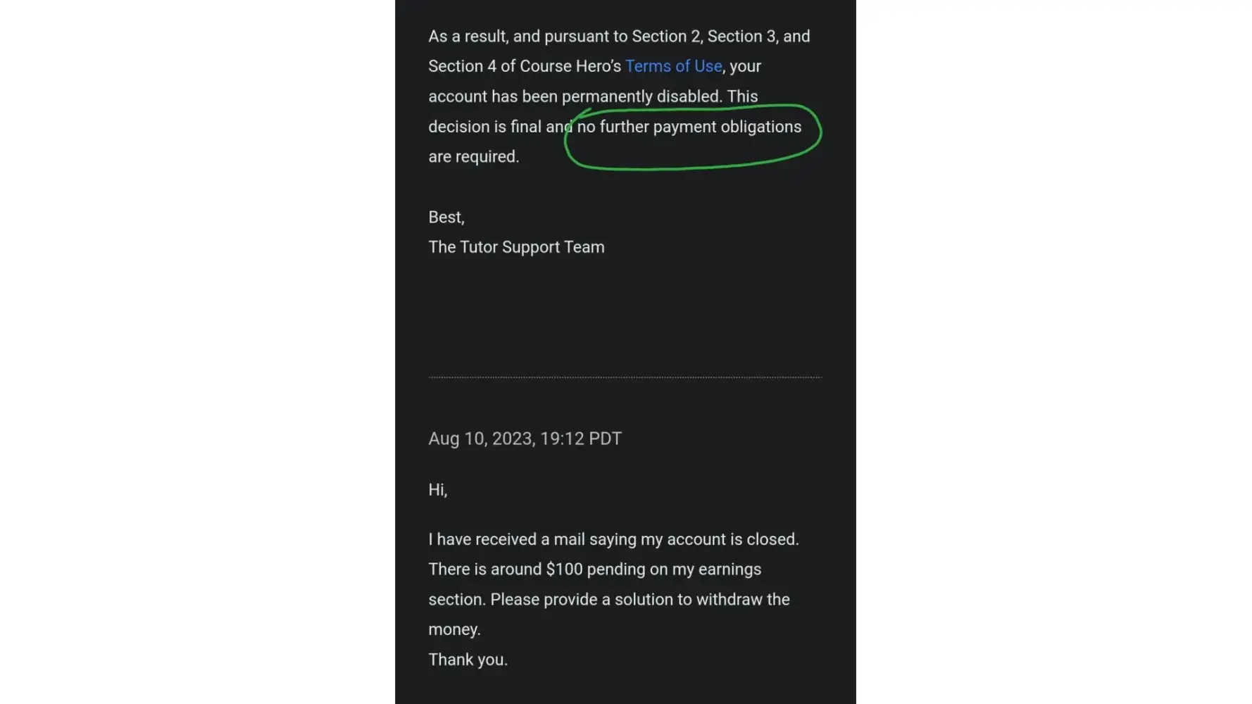 I strongly believe that I have not violated any of your terms and conditions, and I am eager to cooperate with you to resolve this matter. This work on Course Hero has been a significant financial support for my family, and the earnings I've accumulated are a result of hard work and dedication.