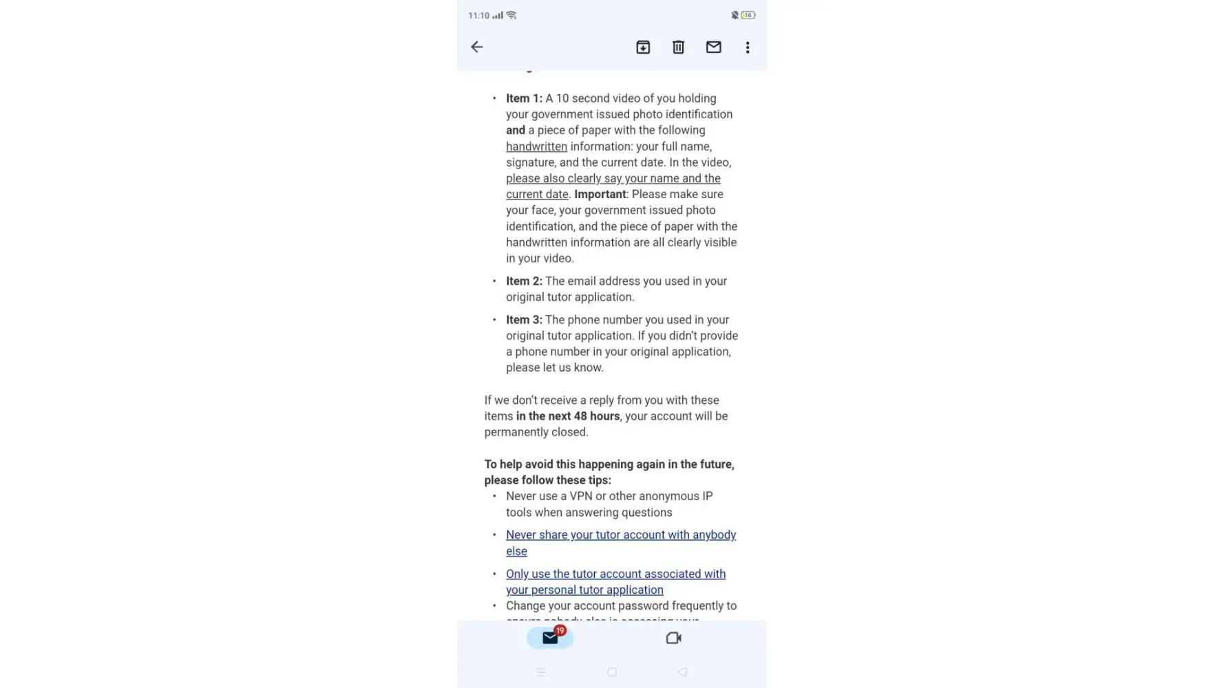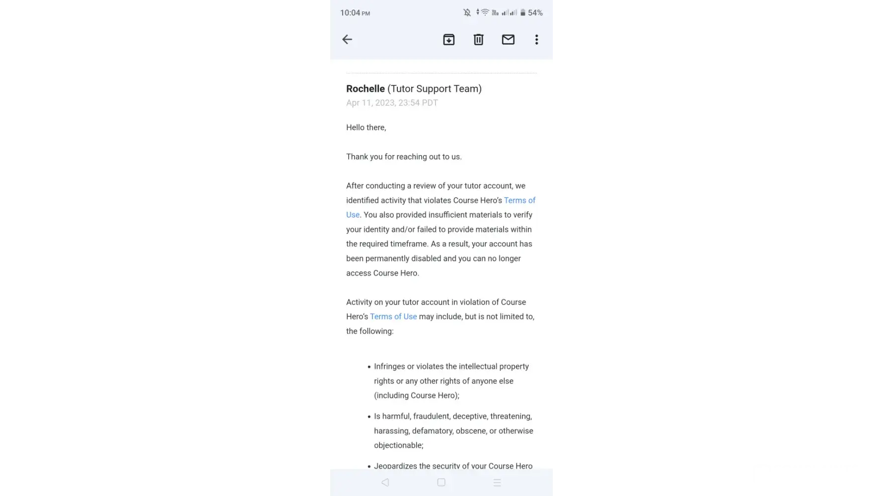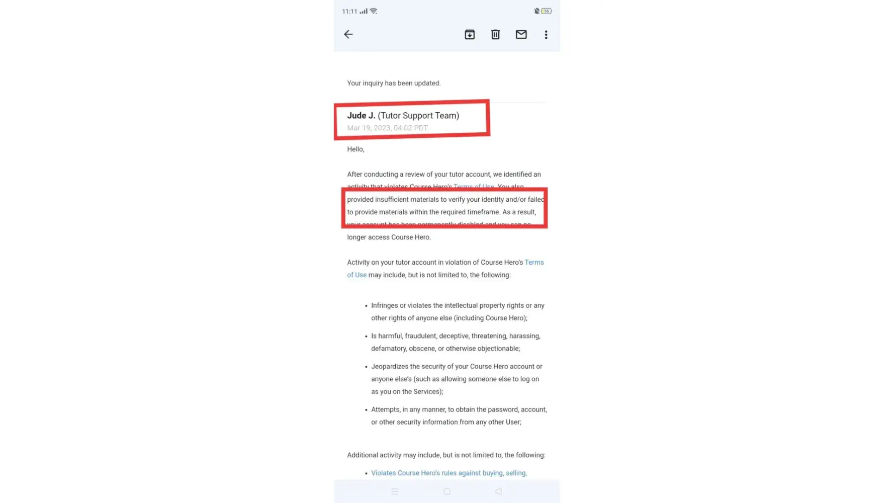 My account in Tutor was suddenly banned PERMANENTLY with my hard-earned money of more than $79 (from the last time I have seen it) and still expecting more than $25 to be received once accepted by my students. They have notified me that "We identified unusual activity on your Course Hero tutor account that violates our Terms of Use" in which I did not in any way. So as instructed, I went to submit the necessary information containing my government ID, a paper with my name, signature, and date of when I created the video, as well my registered email and number. And they responded with "After conducting a review of your tutor account, we identified activity that violates Course Hero’s Terms of Use. You also provided insufficient materials to verify your identity and/or failed to provide materials within the required timeframe. As a result, your account has been permanently disabled and you can no longer access Course Hero." Like WTF? I gave everything they asked to reactivate just 1 HOUR AFTER THEY NOTICED and didn't violate anything in their terms or anything. I contacted back their support team ([protected]@coursehero.com) and responded that it was final and will no longer be amended "Please note this decision is final, no further payment obligations are required by Course Hero, and for security reasons we can’t share any additional information". Clearly a TRUE SCAM when your earnings through this platform increase, they will do their best to rip you off it and just create a random scenario that you will that will unable you to get what you earned hard.