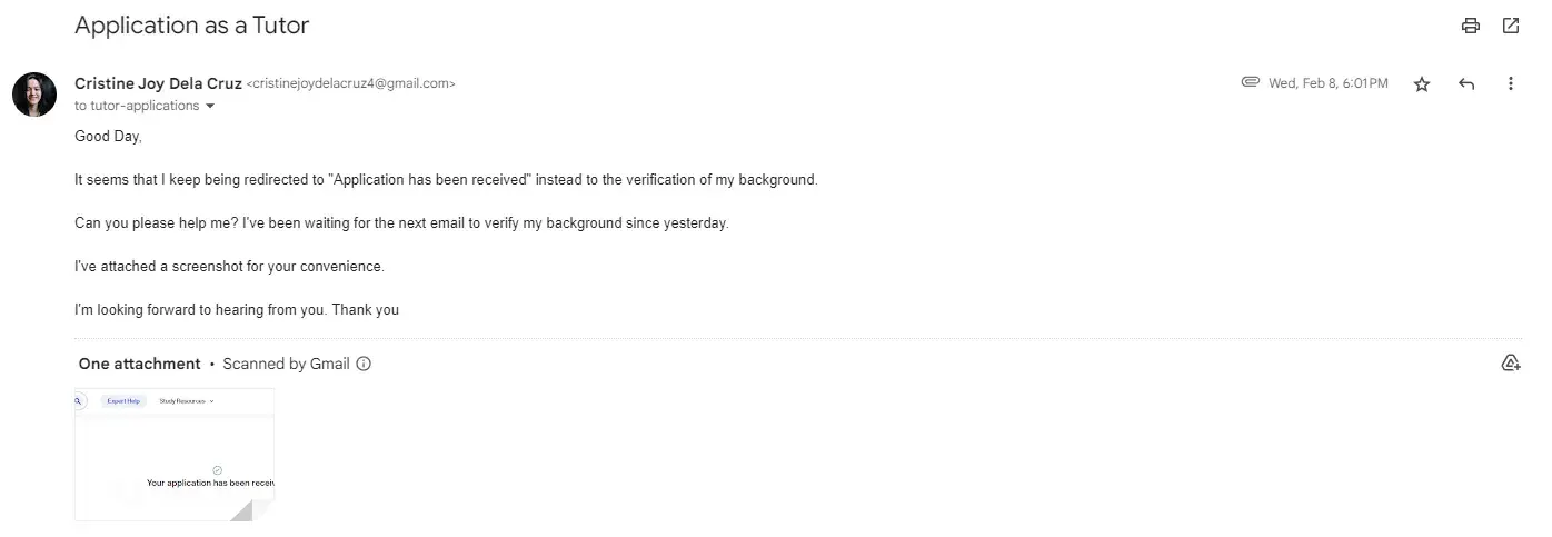 I applied as a tutor last month and after submitting all requirements in Step 4, a window popped saying that “Your application has been received.â€