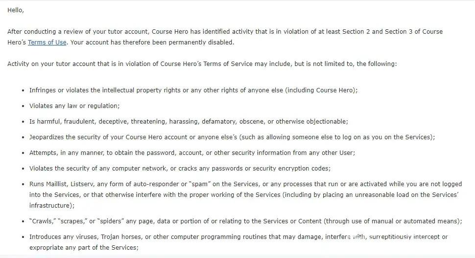 My account my permanently disabled due to violations that I have never done on my part. It is really frustrating because they permanently disabled my account wihthout valid reasons. If Course Hero can let me withdraw my remaining that I have, I worked hard to gain that money but Course Hero is not letting us withdraw the moeny. Now, if they will not reactivate our account is there any legal way where we can send our complaints since Course Hero has no plan on putting actions on our concerns.