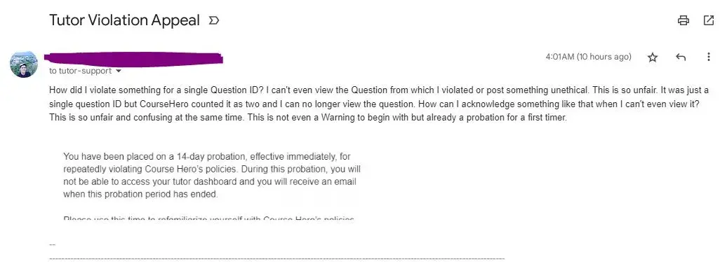 I believe that I have been unfairly penalized, and Course Hero has not provided me with any clear explanation for their actions. They have not given me an opportunity to appeal their decision, and they have not provided me with any further information about the alleged activity on my account.