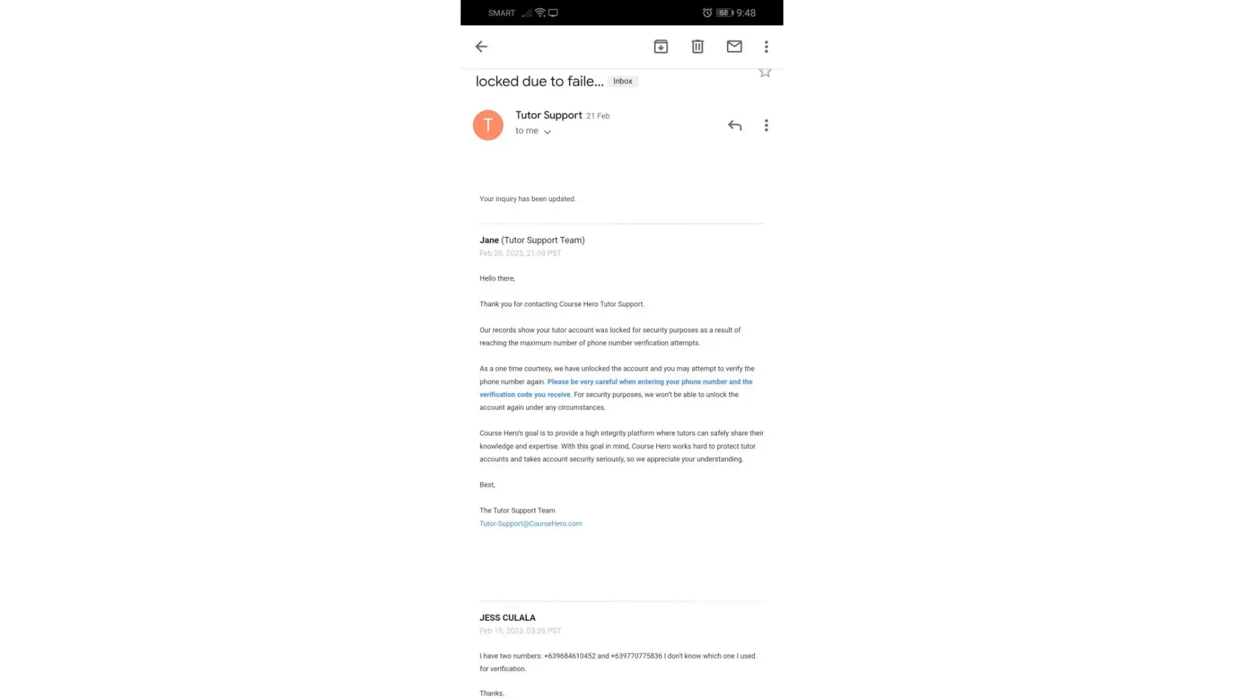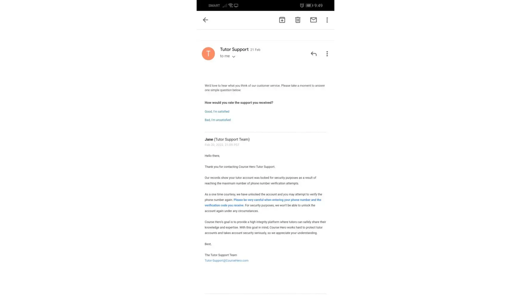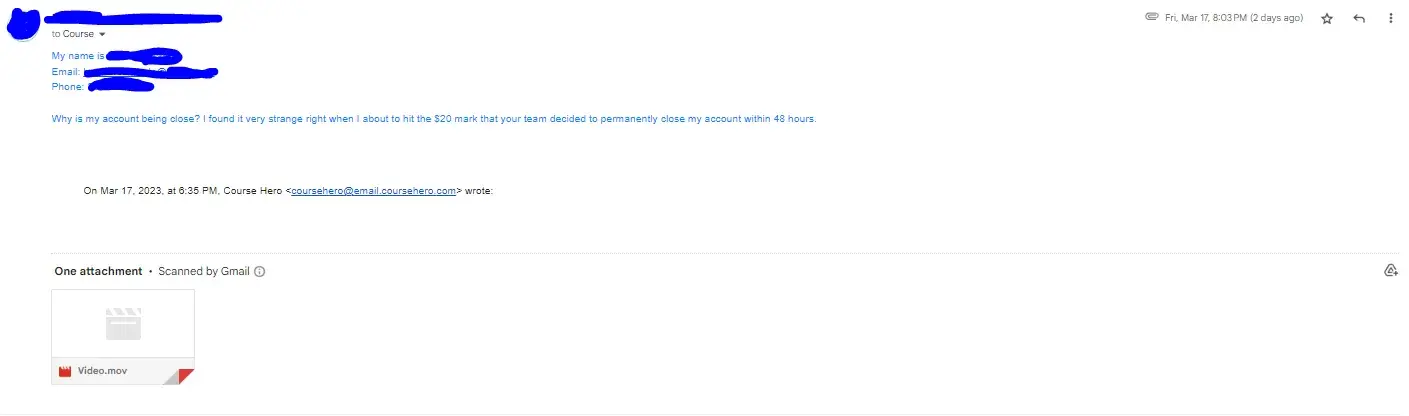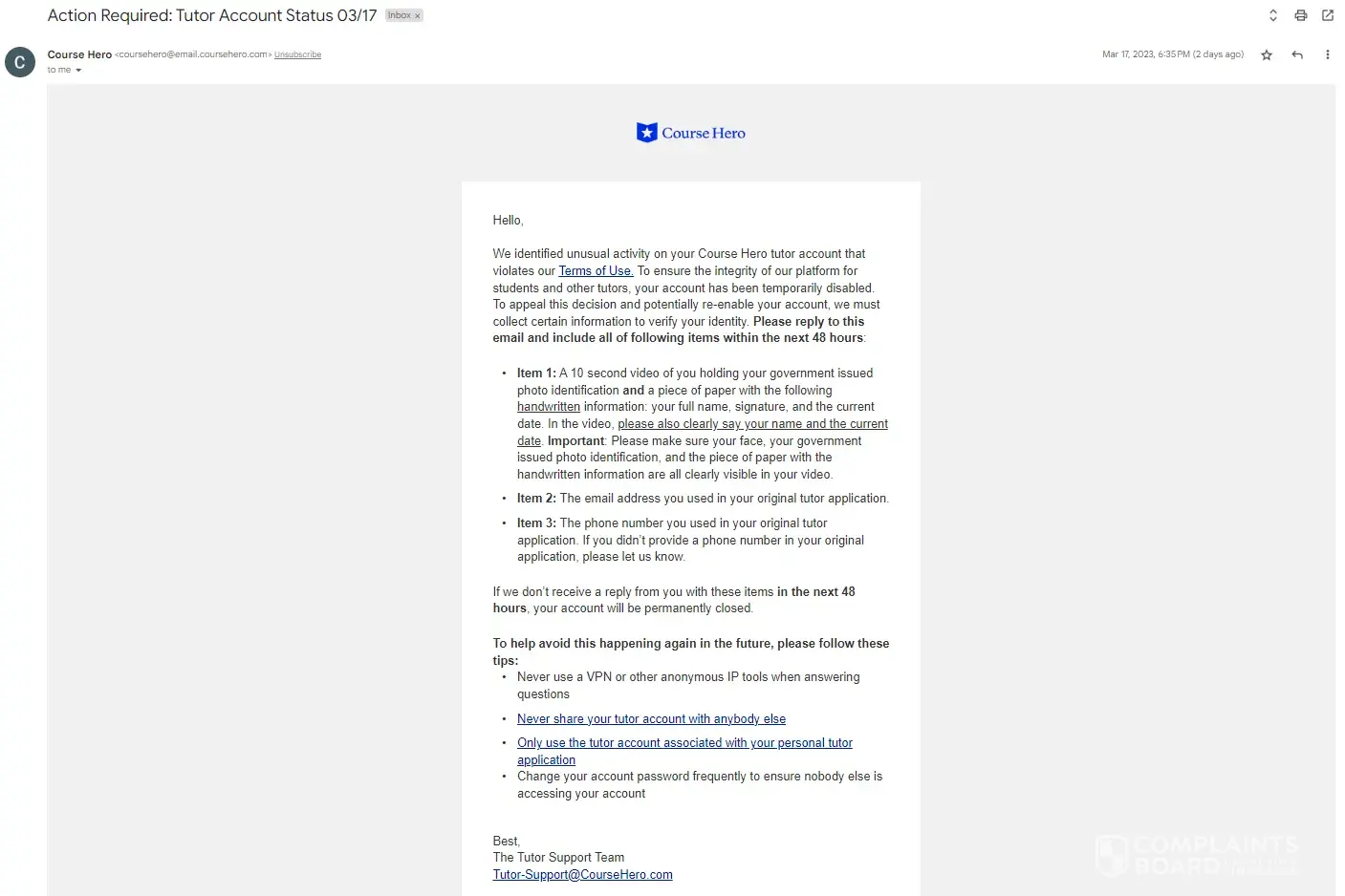 I got an email from CourseHero on March 17, 2023, at 6:35 pm Central Time saying that they saw an unusual activity on my account and decided to disable it I have 48 hours to send in 3 items for verification so they can reactivate it. I've sent in those 3 items to both the replied email which is [protected]@email.coursehero.com and [protected]@coursehero.com.