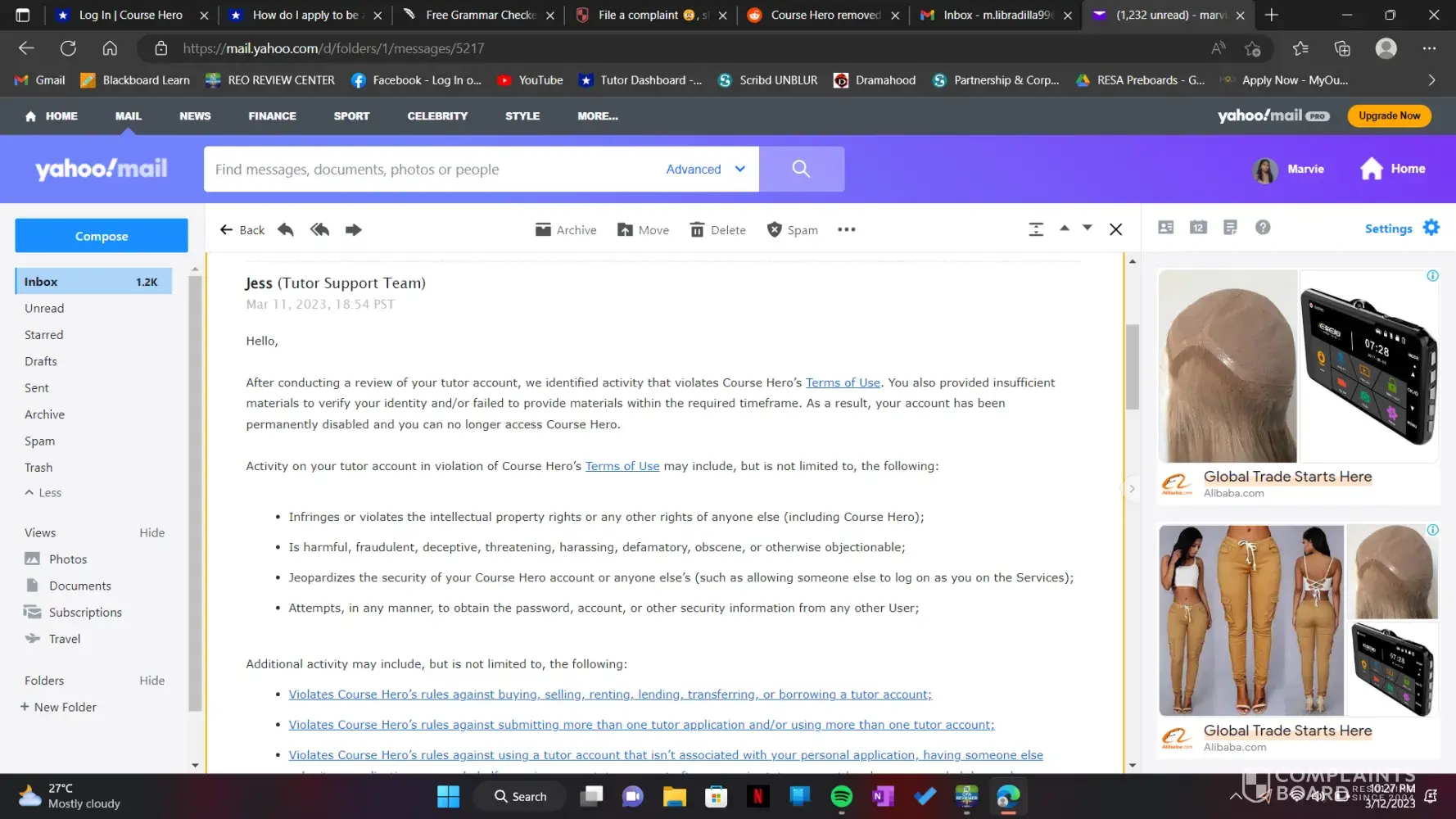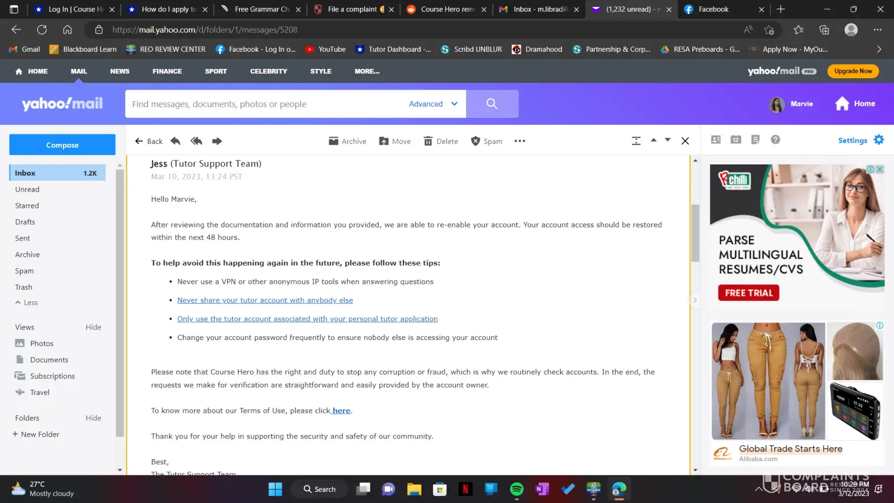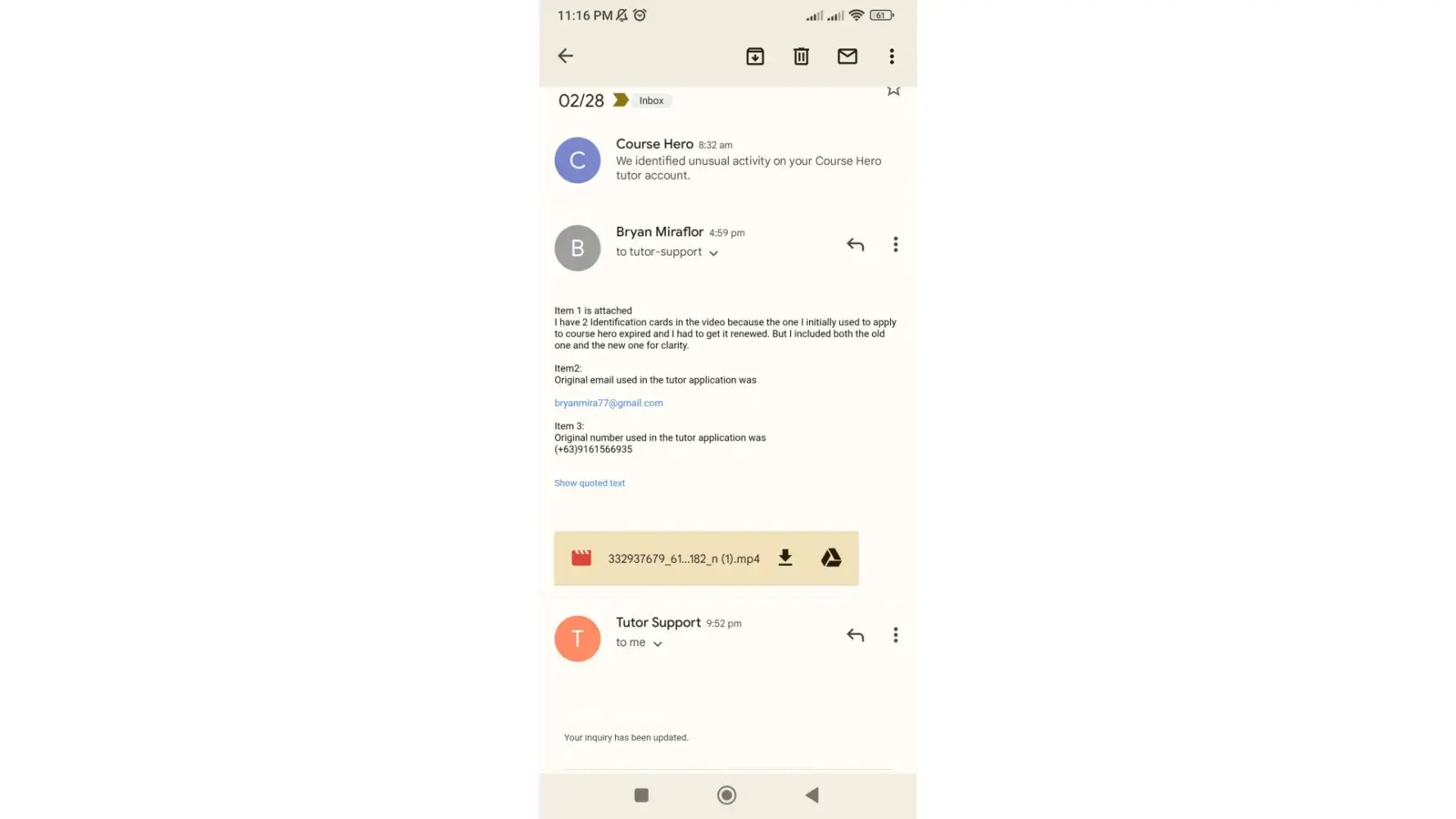 I got an email from CourseHero on March 17, 2023, at 6:35 pm Central Time saying that they saw an unusual activity on my account and decided to disable it I have 48 hours to send in 3 items for verification so they can reactivate it. I've sent in those 3 items to both the replied email which is [protected]@email.coursehero.com and [protected]@coursehero.com.