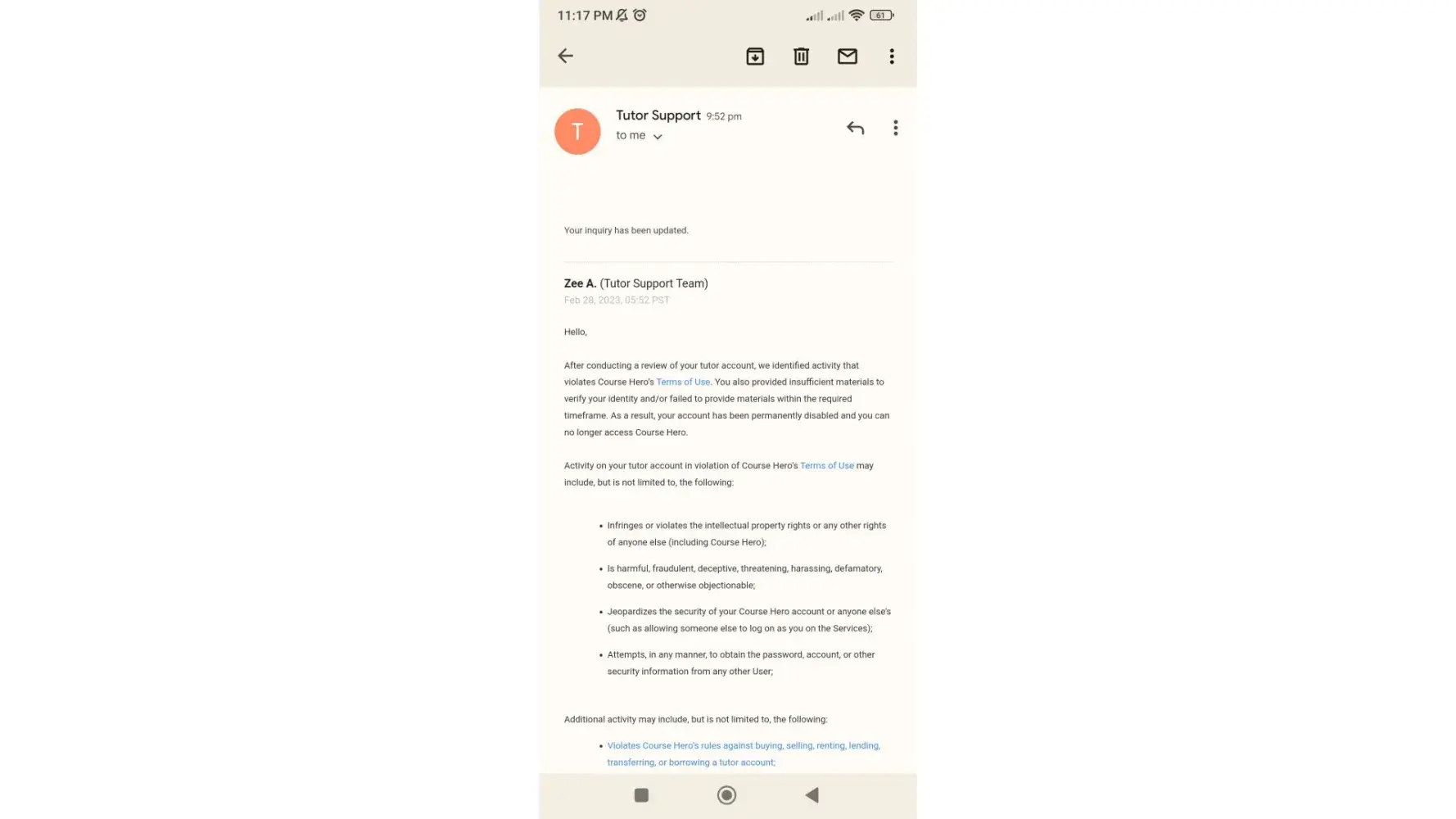 On 03/13/23, my tutor account [protected]@gmail.com was permanently disabled without cause. When I tried to withdraw my first payment it is said that may number cannot be verified,so I email the [protected]@coursehero.com , they say that I violated the section 2 and 3 but I have not broken any of the Terms of Use rules nor is Course Hero able to specify in which way I personally have violated any of their terms other than a general "Sections 2 and 3", which I have not broken. I had over $141 waiting to be withdrawn and Course Hero is denying me access to the money I earned.