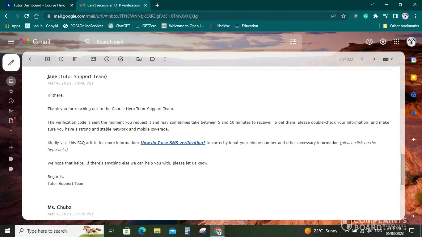 I am writing to follow up on the issue I've been experiencing with the SMS verification code. I have been trying to withdraw my earnings from CourseHero for almost a week now, but I have not been receiving the SMS verification code needed to complete the transaction.