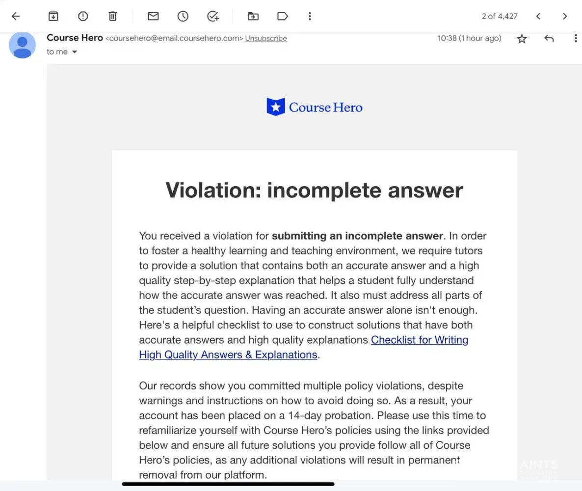 I got an email on 9 march 2023 that i have recieved a violation for a question for it being incorrectly answered and recieved a probation for 14 days.