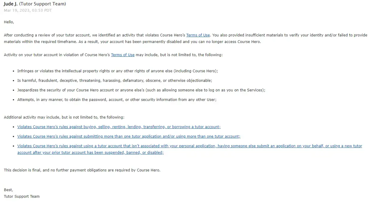 Then Judy (agent from CourseHero) emailed me back on March 19, 2023, at 5:53 am Central Time saying that I have failed to send in those 3 items and she prematurely disabled my account. I found it very rude that she closed my account a lot sooner than the 48 hours timeframe that was promised and she didn't review my previous email. This is very unacceptable, especially with a generic reply email. From looking at outside forums and complaints, it seems like this is a common issue for the CourseHero team to disable an account even with the given verification documents. Please fix this