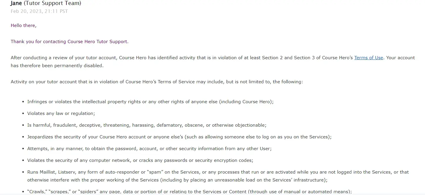 I am sorry to hear that you can no longer use Course Hero's (CH) services since you violated their terms of service. This type of fraud has impacted more people than just you. Several tutors all around the world have been impacted by the tutor support team's deliberate account disablement of those tutors to steal their laboriously earned money. At the start of last year, CH undoubtedly deactivated the accounts of thousands of tutors for dubious reasons and false allegations. CH has mathematically withheld a sizeable portion of the tutors' pay, or about millions of dollars. Notwithstanding how profitable CH has been, it is currently working behind the scenes to commit fraud. Everyone in our country who has been affected by CH is aware of this and does not want to be associated with this now. It is clear that CH is having financial difficulties given that the United States entered a recession in the summer of 2022, but stop robbing sincere international tutors to solve your domestic issues. It is unethical and unprofessional to suspend tutors' accounts without a good reason. The tutors should therefore receive their pay because they earned it by giving the students' queries the right answers.