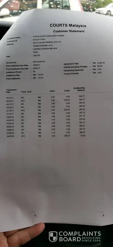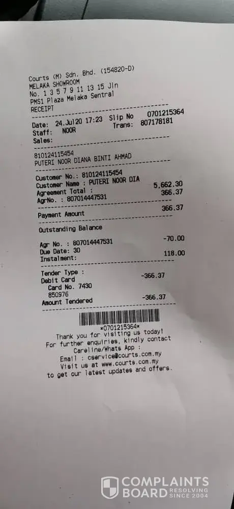 I am Abdul Halim Bin Abdul Hamid ([protected]). Upon contacted by a Courts collection agent, I have made a full payment of my long past due, based on full settlement discounted amount as mentioned by the agent, of RM2, 000 + RM143 (claimed to be a legal fee) on the 17/12/2020 and 30/12/2020 respectively. Both payments were made at the Courts Jalan Genting Klang, Setapak Kuala Lumpur.