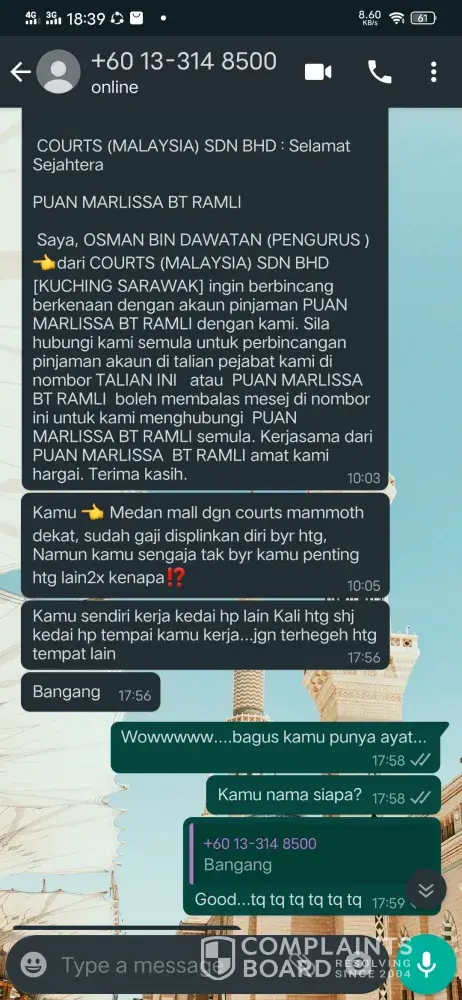 Saya nak complaint sikit pengurus nama osman bin dawatan is "bad attitude" dari courts mammoth kuching. boleh bagitahu dia jangan kurang ajar sangat bila berurusan dengan peminjam. jangan mengeluarkan kata kesat seperti "banggang'. walaupun saya ada tunggakan.. jgn sampai mengeluarkan kata2 yg tidak sedap di dengar. macam tu ka perangai seorang pengurus? saya harap pihak court mammoth dapat ambik tindakan dengan pengurus nama osman bin dawatan