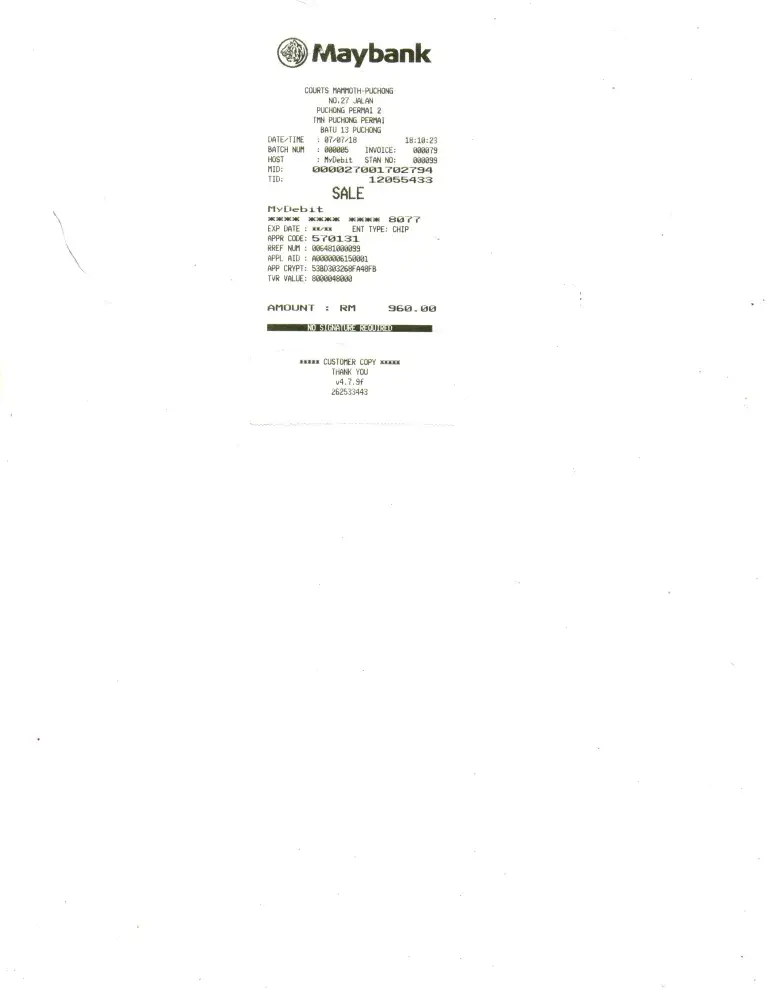 Back to story, we asked this girl to call up her manager. The manager came and try to solve our problem. After an hour I only found out that this NORAIDA actually WAVE my husband's debit card on the first transaction. The amount was RM960.00, wave function have limited amount and as far as I know only cap at RM400.00. How come she can wave my husband's card? After waving, my husband needs to keyed in password. Then she claimed it did not success and she do it again. This time successful. First things first, this NORAIDA made a mistake by waving the card without asking my husband's permission. Waving is not something you can do without asking the owner's card permission. We can sue her for this.