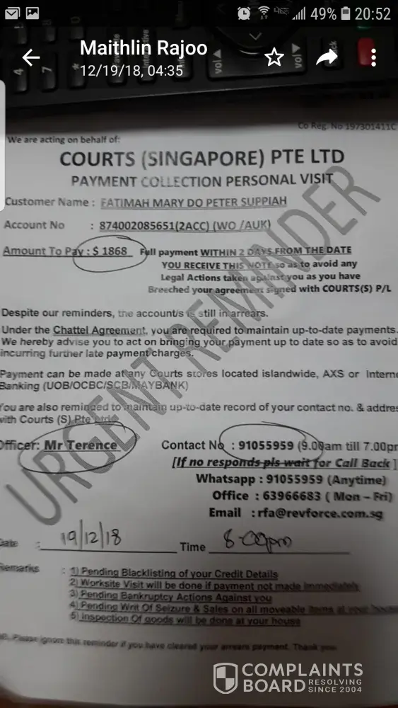 I am Mr Kee here, I am facing difficulty of paying the bill under courts account as I just get a job not long ago and I understand that I have own a outstanding amount under courts but your engage the company Bryan Louis partners & associates Management a person name call Ms Adi that attended to my is not willing to help me on the payment issue and the way she talk is very rude. I really hope you can understand how I feel. Hope you can seriously look into this case. now I have no choice I will try my best to see how to made the payment before the 14 dec 2018. Pls kindly get back to me on this issue Thank you my Hp number [protected].