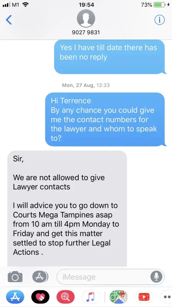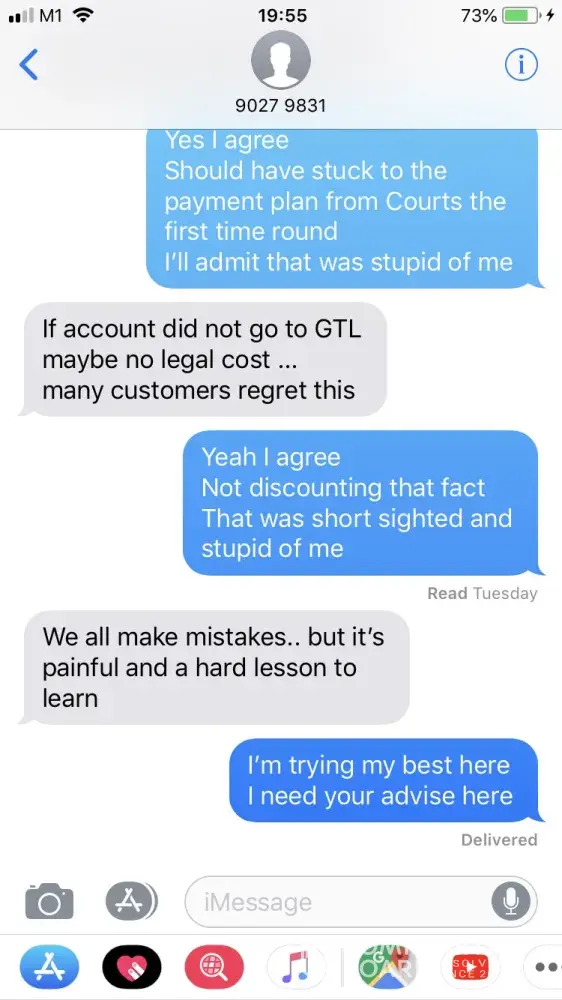 I am writing to you imploring for assistance. A little background on my situation; I had purchased some items from Courts in December 2011. My first installment was due on Feb 2017 however in my stupidity and lack of clarity of mind, I had lapsed the payment due to Courts. Subsequently, the account was handed over to GTL (Guan Teck Lim) which was then given to the bailiffs to remove the items from my home; i.e., couch, refrigerator, washing machine, stereo (and some other items I cannot remember). I did ask for the list of items removed from my home as well as the breakdown of the cost of the items that would go to paying for the amount owing to Courts. I was told by GTL that the breakdown of the items as well as the cost and the balance due would be sent to me; till date I have yet to obtain anything. This has been going on for some months now, and every time I called GTL, I am given the runaround. GTL says they have no emails to correspond with and can only do so via calls; so how do I be able to track our conversations? Left with no other choice, I approached Courst via email again and asked for the SOA. They had sent me the SOA albeit by mistake (the officer sent another email to tell me to "forget" about the email). In the SOA dated, for the transaction date 2/8/17, it showed a balance of $1802.37. This is one year ago from today. Based on that I would have paid off all the monies owing to Courts and would be deemed free and clear. However, I received a text message from Revelation Force (i believe) telling me about the monies I owed. At this juncture let me say this, the payment for the month of Aug 2018 was held off so I could get someone to call me. That is when this person contacted me and told me the amount owing was $302.37. He then said he will confirm with Courts again. The next I hear from this person I owe something to the amount of $3500. How is that possible? What have I been paying thus far? I am being harassed both mentally and emotionally. My family life is affected and I feel I am on the verge of a mental breakdown. When I asked this person about the supposed monies owing, all he said was he can't reveal and can only say this is the total amount, however if I were to pay off $3200 in cash (in one time), the account would be closed.