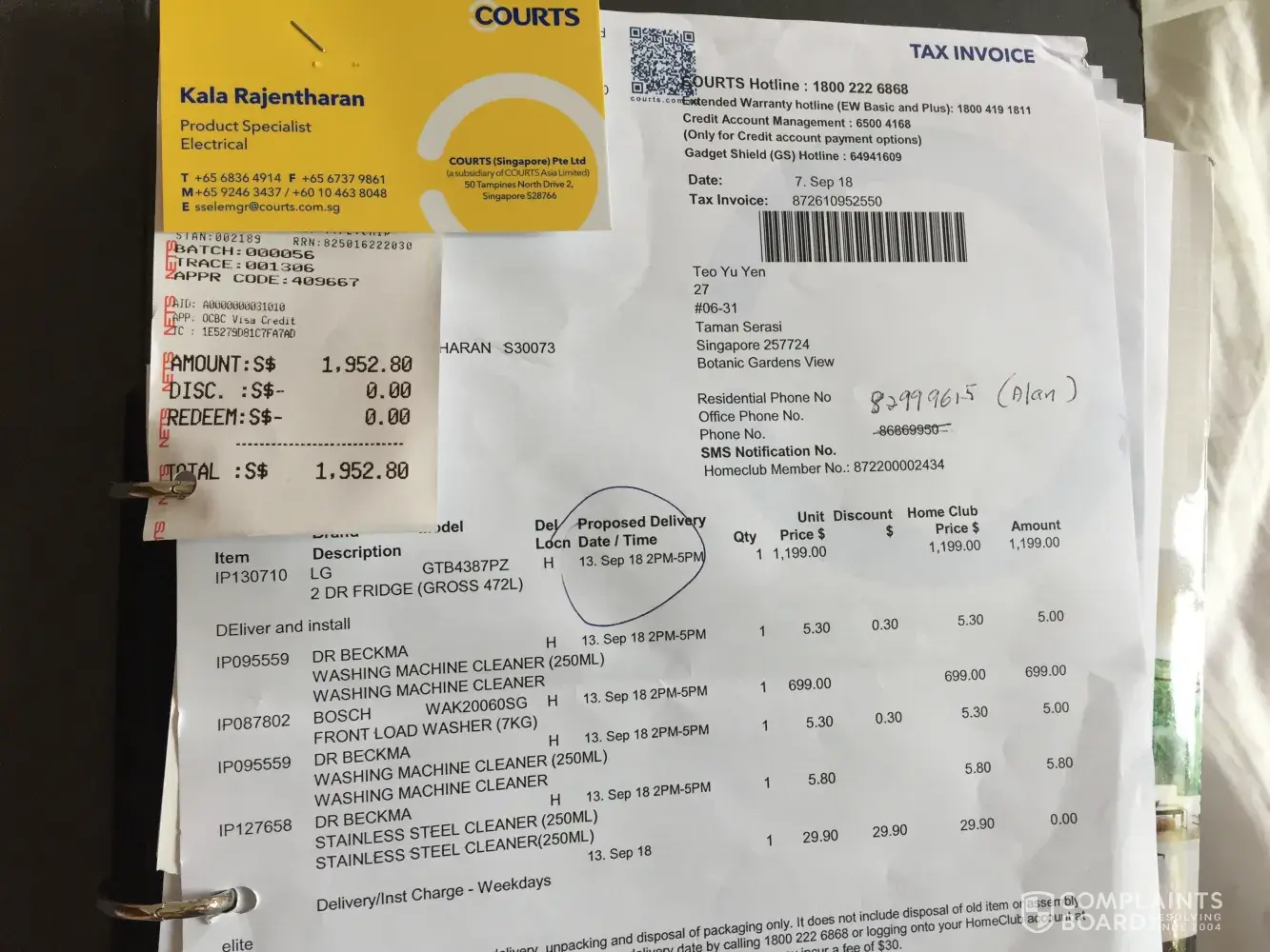 We purchased a Panasonic refrigerator - Invoice Number: [protected], on 18 August 2018 and arranged for delivery to our home on 3 Sep 2018. Our delivery was scheduled from 11 am to 2 pm by Courts at Woodlands Causeway Point outlet.