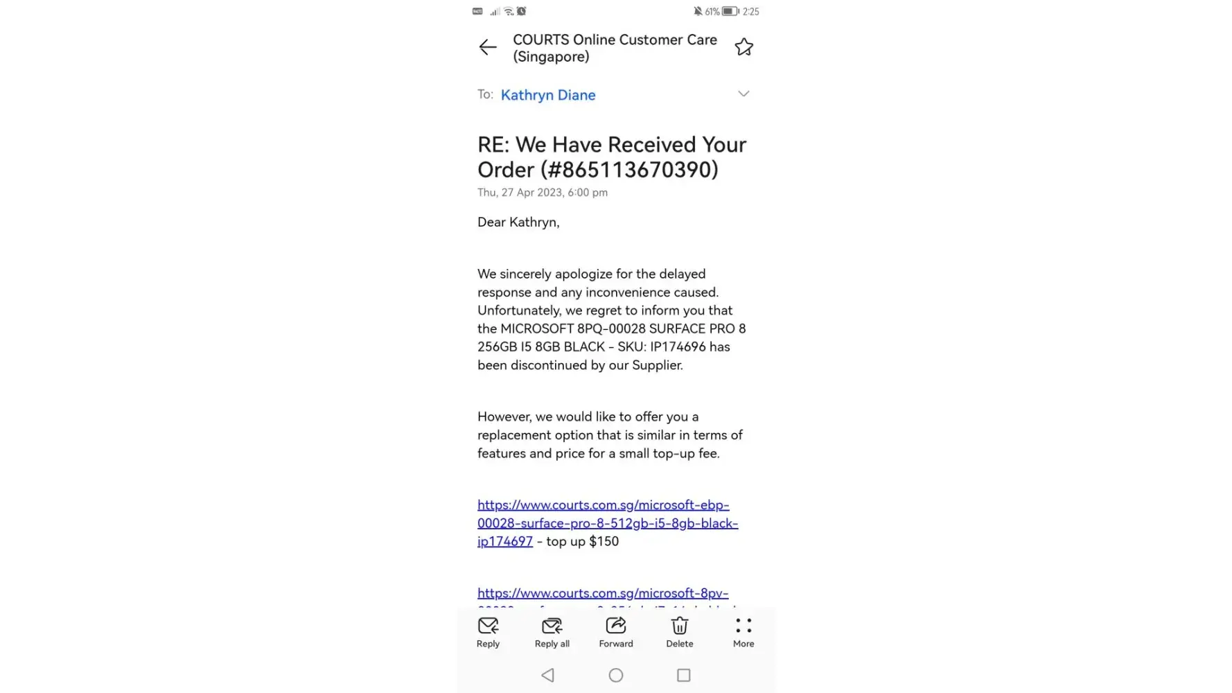 Worst online purchase experience from courts. Practically wasted my time. Puchased a Microsoft Surface Pro 8 i5 8gb 256gb on 19th April 2023. Received an email from online customer service stating that they are unable to deliver the item on the expected date as the stock has not arrived at the warehouse. Informed that i require the laptop urgently as i have an upcoming exam. On 27th April received another email stating that the product has been discontinued and asked to top up $150 for either microsoft surface pro 8 i5 8gb 512 gb or S$200 surface pro i7 256gb. Chose the latter and made the additional top up. Again, delivery dates cannot be given and mentioned tentatively to set the delivery date to 2 May 2023. Received an email again stating that the product is defective and they gave me an option for a refund of $50 for the microsoft surface pro 8 i5 8gb 512 gb however they are unsure on when they will receive the item. Told them to proceed and once again, received an email on 3 May 2023 that the product has been discontinued by the supplier. RIDICULOUS. NEVER GOING TO TRUST OR PURCHASE ANY ITEMS FROM COURTS EVER AGAIN.