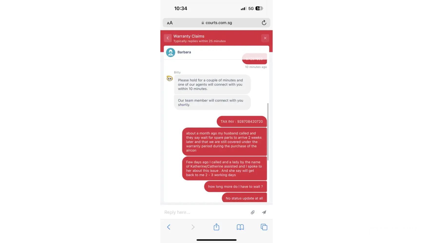 - Went to virtual online assistance ( refer to photos attached ) and 2 days later no one get back , therefore I called customer service again yesterday on 07 May 2023 and the lady by the name of Hiaty(sorry if I spelled her name wrongly) told me that parts may even take months to arrive and there is no fixed date she is able to give on the arrival status update as the relevant team has yet to get back to them and our case is still pending