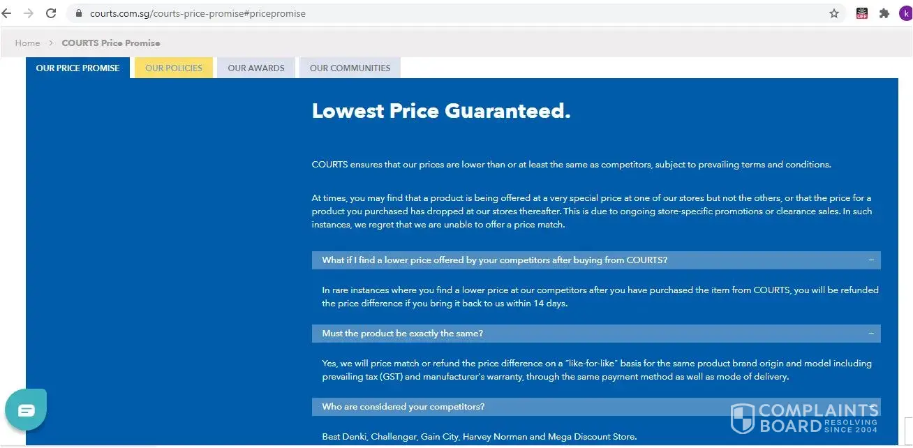 Later today, my friend alerted me that the same product is priced online only at SGD 699 at Best Daikin as well as Gain City, I immediately called Customer care referring them to the Court's Low Price Guarantee link and the writings. And none of them have ever responded anywhere near to the promise that Courts has made in their Low Price Guarantee. They said they have escalated to their management and waiting and I have no reference of the complaint or ETS shared.