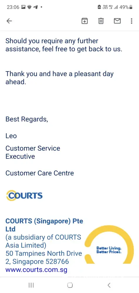 I sent an email to [protected]@courts.com.sg, and I am waiting for resolution.