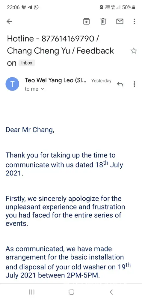 I bought a washer on the 10/07/21 and was expected to be delivery/installed on the 17/07/21. However on the 17/07/21, the washer was not installed as the driver mentioned that needed to do a 3 pin wall mounting inorder for installation. I called the customer service and report this. I was told by the customer service regards of this however he mentioned that I will be charged for 2nd trip depends on sales team can waive off this. I disagree with this as I was not informed regards of such requirement for replacement of my spolit washer. The sales from Tampines contact me on the 17/07/21 will write to waive off this, however I received back mentioned that the waiver is rejected by the logistic. I called back to customer service, however the information I received is the waiver is rejected by Tampines sale manager instead. I am amazed regards of different versions of story. Nevertheless as per my request to have communication with the CS team lead. He agreed to arrange for the driver to disposed and install washer on 19/07/21 2pm to 5pm due to miss communication with logistic and sale. The driver never came at all as mentioned. I had written a email to feedback about this around 6pm on 19/07/21 then I received call from both driver to make arrangements on tomorrow as there is a miss communication again. I refused the services as I don't want to feel being cheated again. Can someone help me on this?