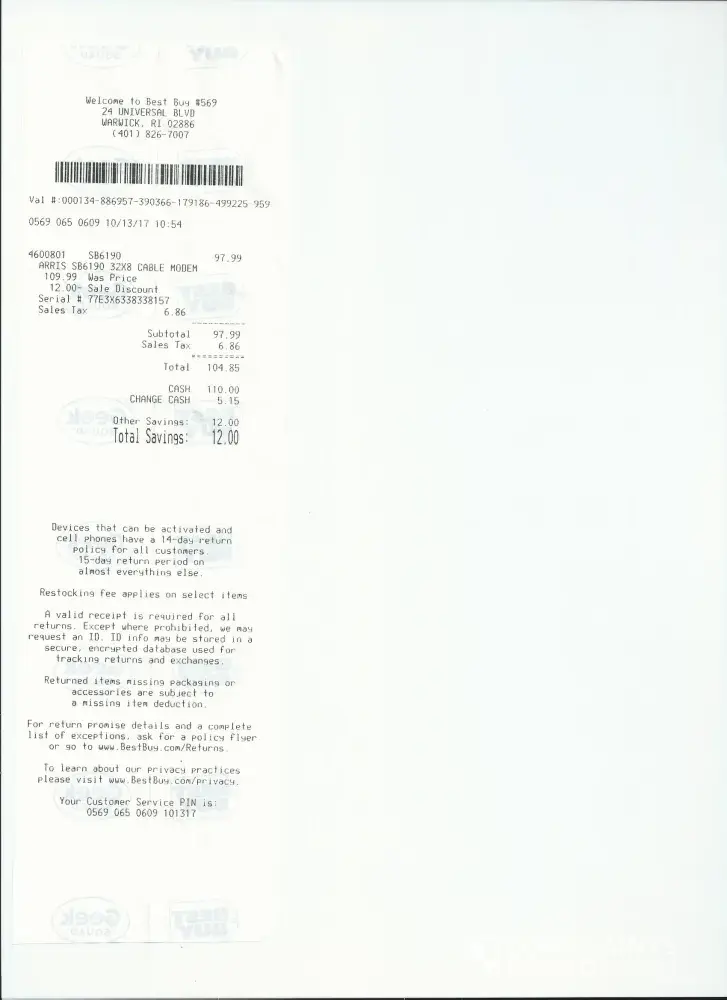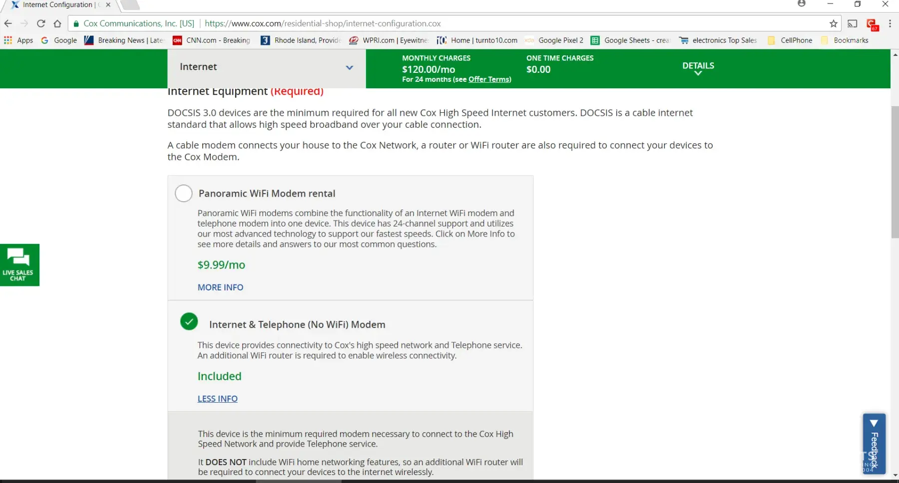 I am writing in regards to my recent installation on 10/13/17. I ordered the Gold Bundle online with the ultimate internet speed option. I chose the telephone and internet (no wifi) modem. At the time of the install the tech informed me that this modem could not support the internet speed I selected. I am not sure why I would be allowed to select this option at the time I placed the order without receiving a prompt informing that this did not support my internet selection. Please see attached screen shot to show the modem selection screen. As you can see, there is nothing informing that the modem would not work. The tech informed me that I could purchase a modem that supports the speed I selected for $180 through Cox or I could use the $9.99/month panoramic wifi modem. I already had my own router because it offers better wifi range than the one Cox offers. Because of this I had to go out and purchase my own modem and return the one that the tech allowed me to temporarily use. (he informed that I would have to return it or would be charged the $9.99/month).