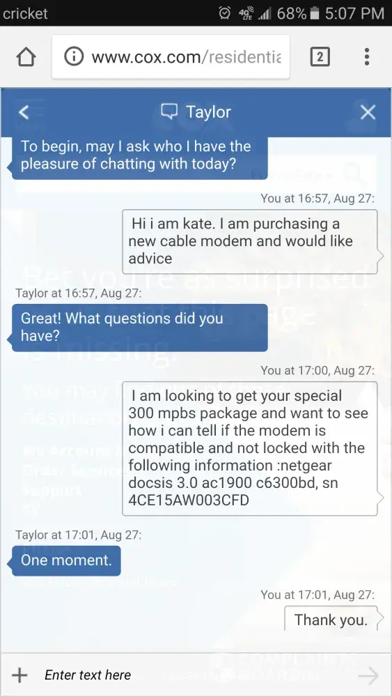 We just moved into a new apartment. We had 100mpbs at the last place we were staying at. It was extremely slow. We decided to upgrade the new service to 300mpbs. In order to do so we needed a modem compatible with Cox and their speeds. After researching online we came across a NetgearAC1900 model c6300bd. All the reviews online said it was capable of over 300mpbs and it was even purchased from Cox a year ago with a docsis 3.0. We decided to reach out to the technical support before we made the purchase and Taylor from Cox answered our question. We gave him all the details of the modem and he assured us it would work. We purchased it and called to set it up. Come to find out, the technical guy on the line said it wasn't compatible and we hung up to try again in case he was wrong. The second time we called it was the same thing. The modem was only capable of 100 mpbs. So we just wasted $100 on a modem that doesn't even work with the speeds we want. Don't trust Cox and their services! Will never move to another place where I have to rely on Cox Communications for internet services again!